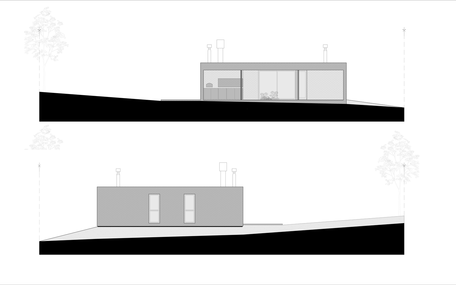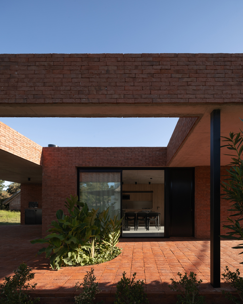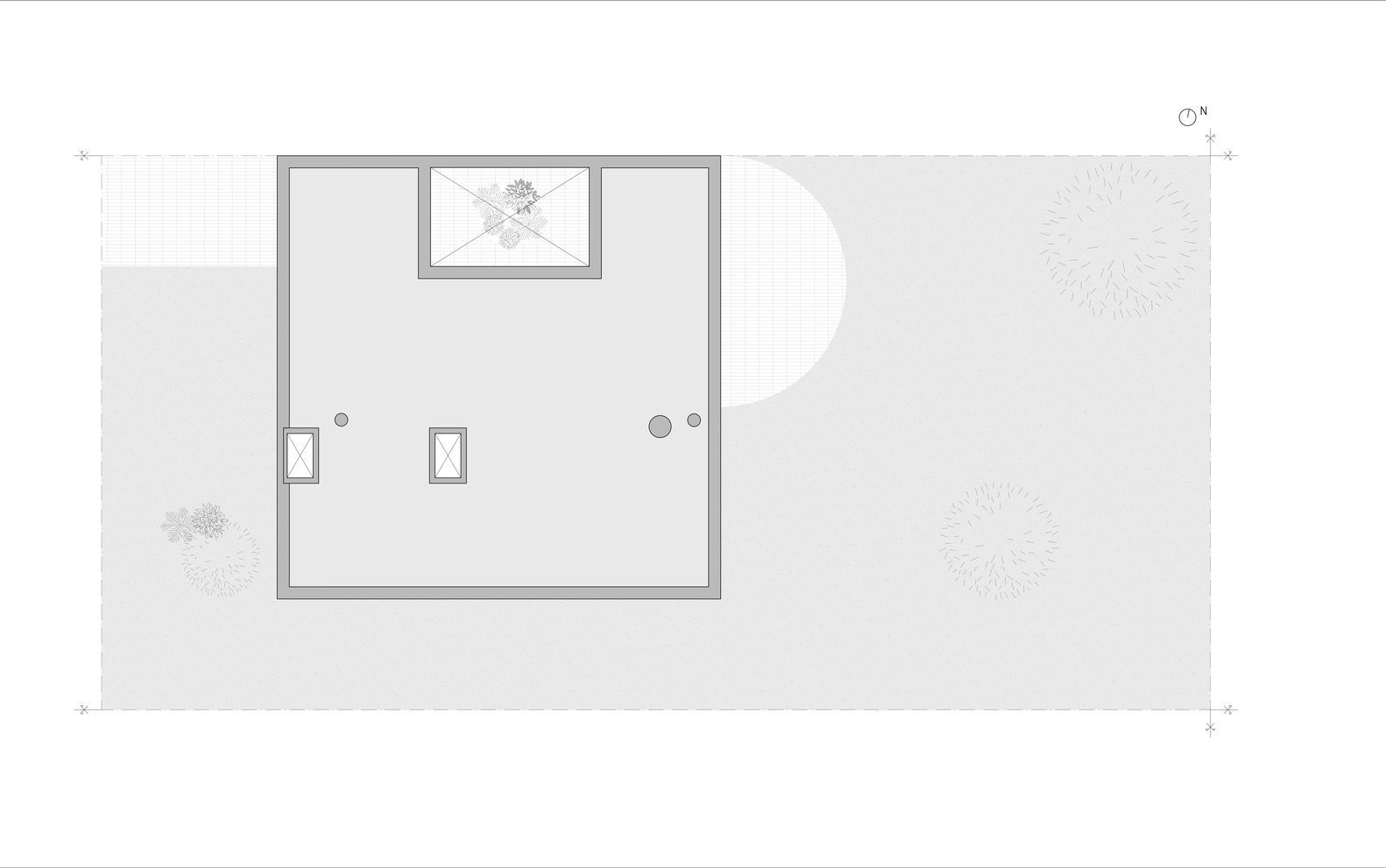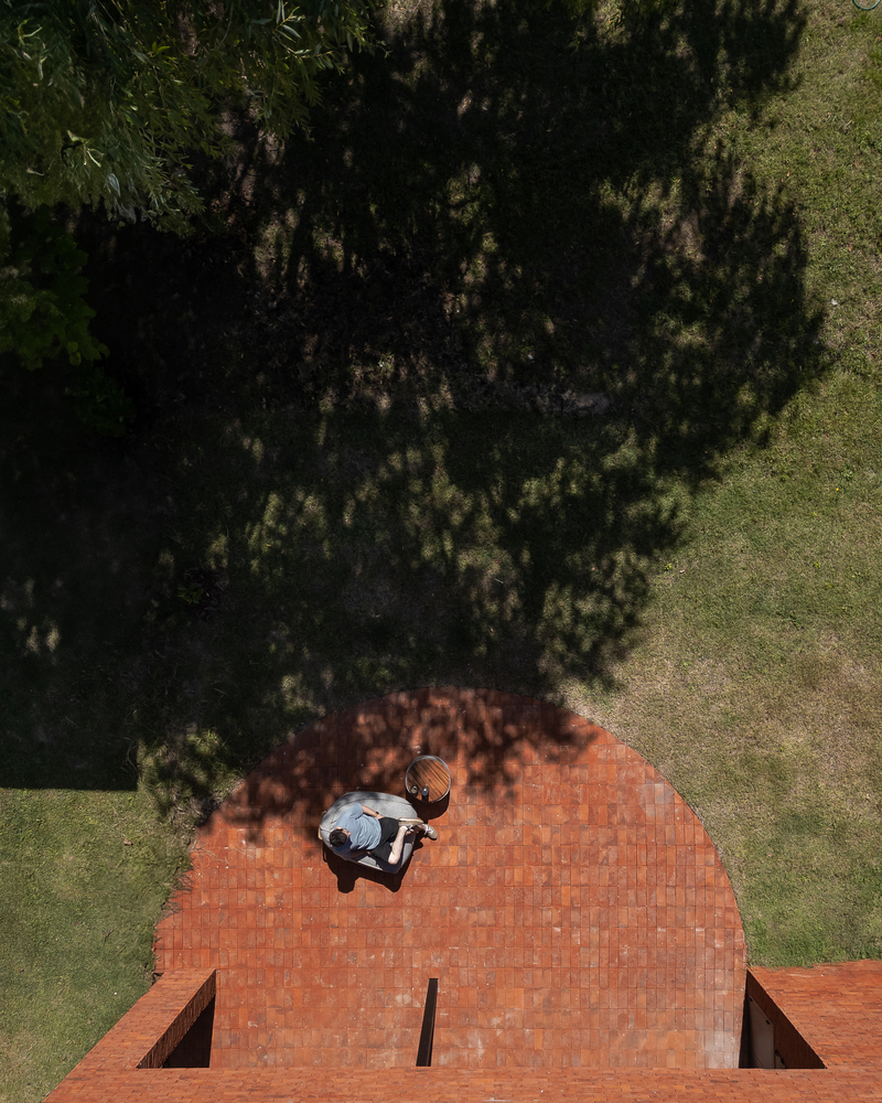 The latter (with a smaller section) are used to define the center of the semi-circle and to frame the open patio.
