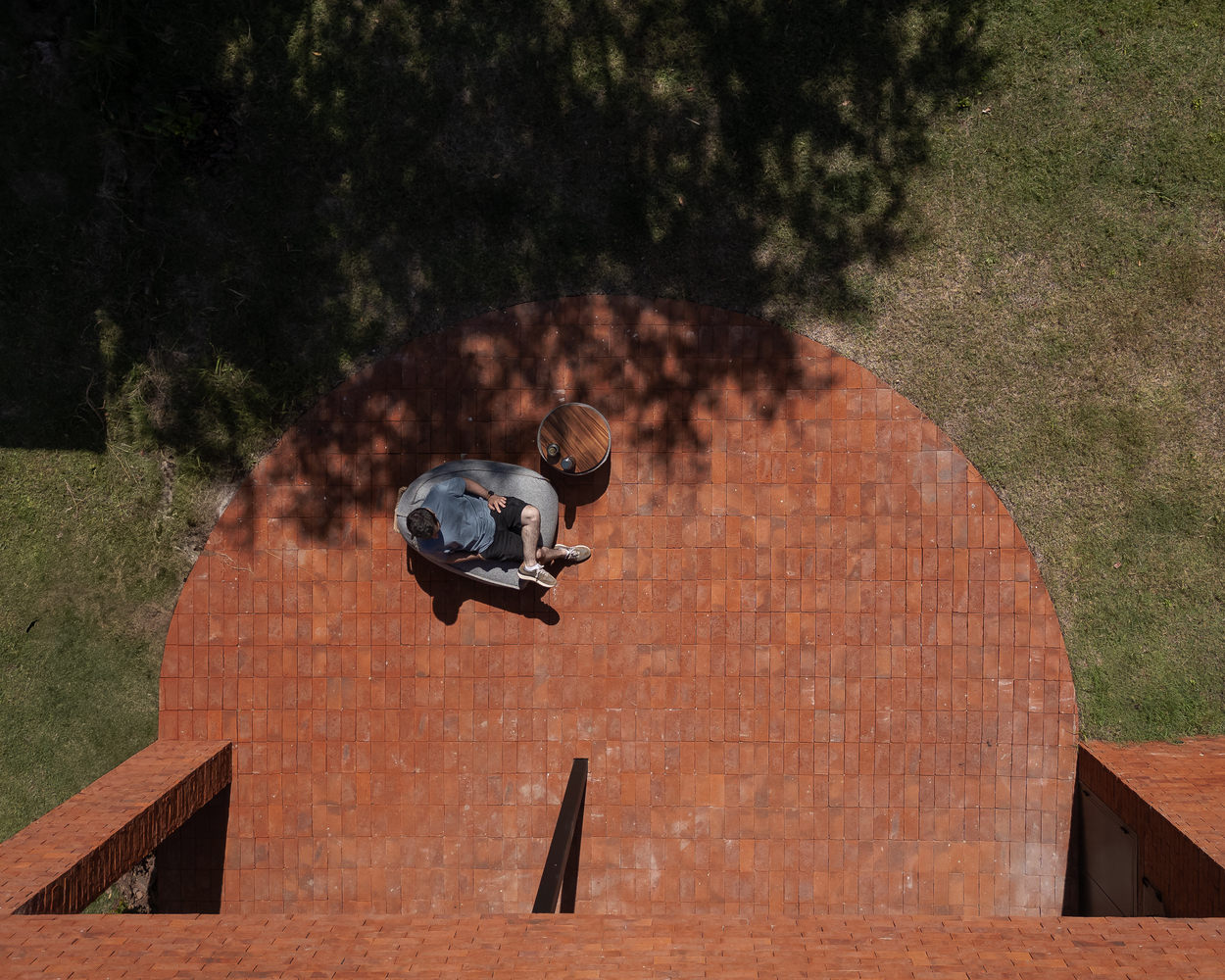direct access to the house or continuing to the open patio, which leads to the barbecue area. At the back, a semi-circular shape reconnects with the interior, creating an infinite loop.