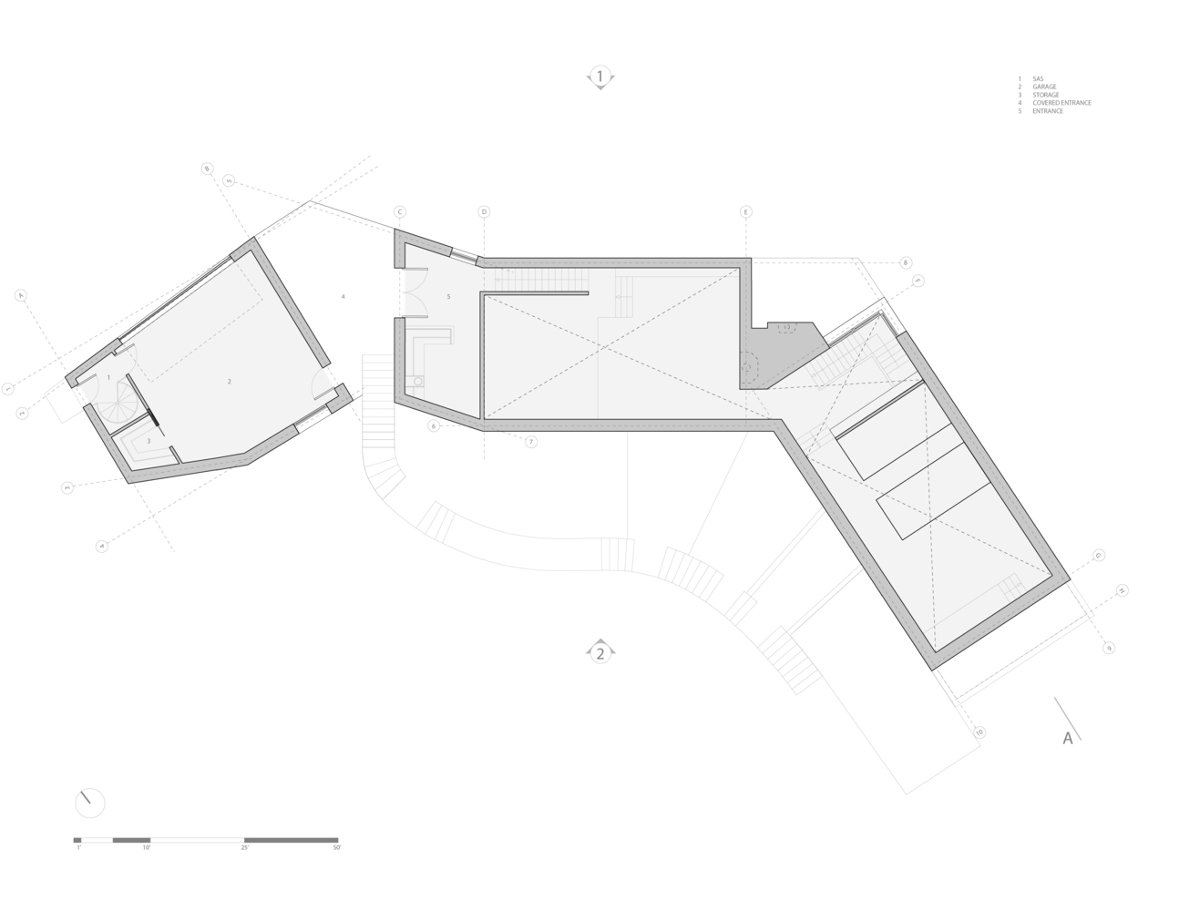 Developed from the very outset in sections, the project is designed above all according to a pre-existing organic path of circulation on the perilous site, initiating a conceptual logic of pathways rather than an arrangement of rooms derived from programmatic components.