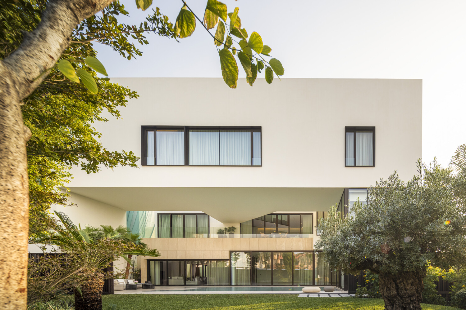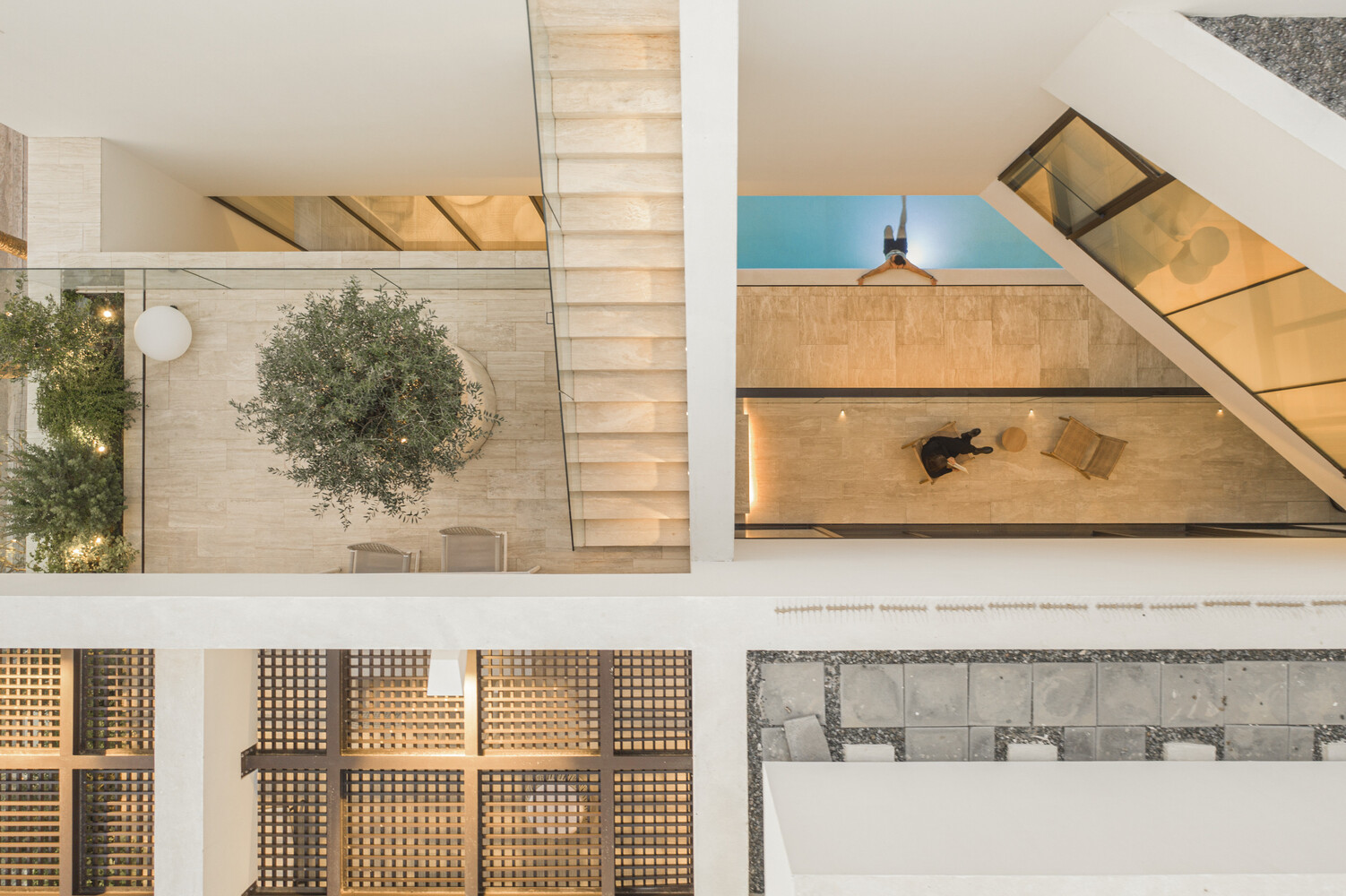 The upper volumes are fragmented and recessed at strategic points, allowing light to penetrate deeper into shaded areas like the portico and pool, enhancing the overall experience with subtle contrasts between light and shadow.