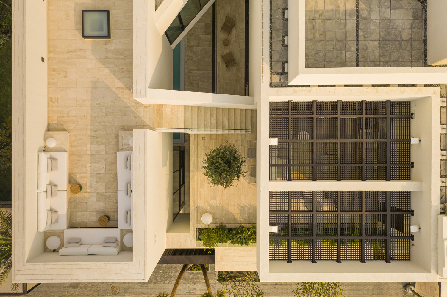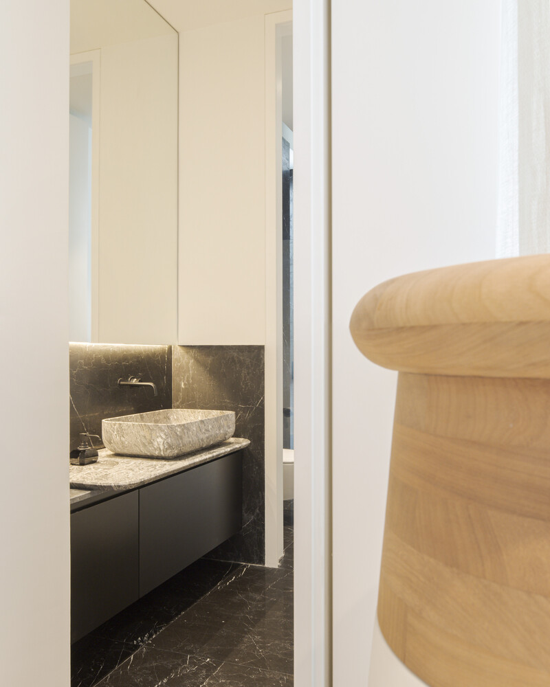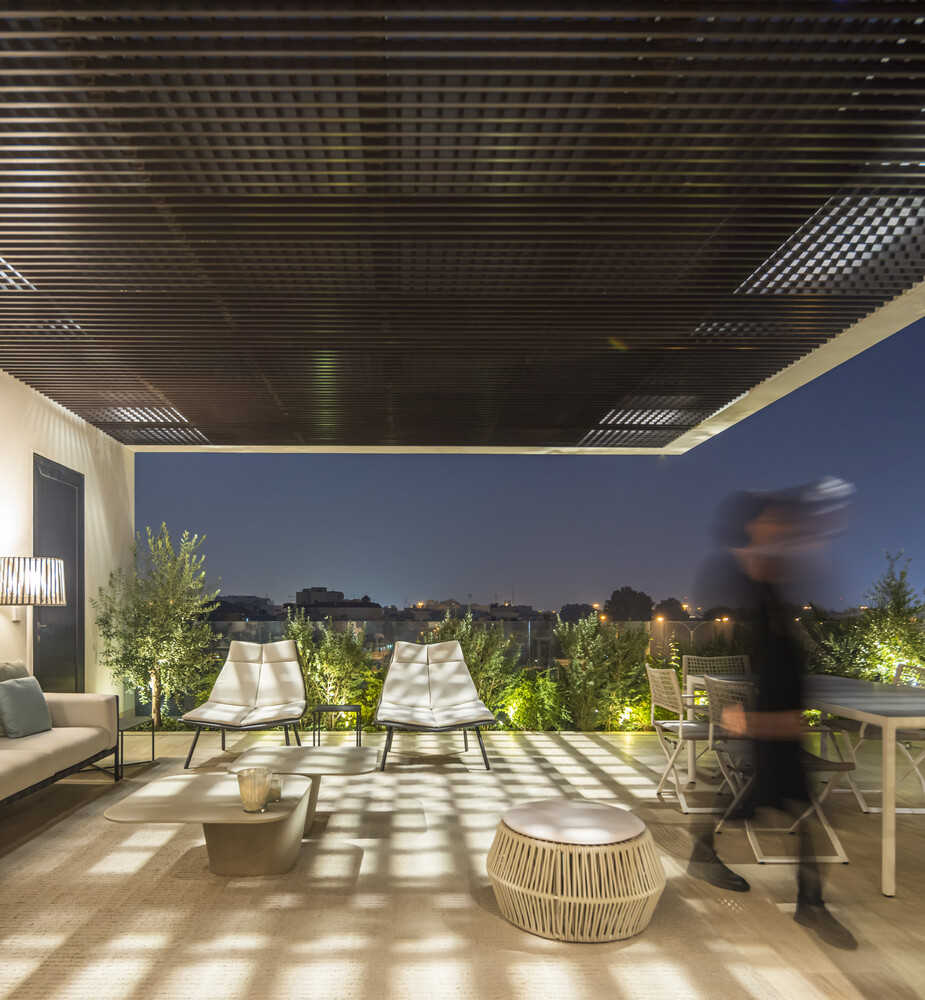 From here, a staircase leads to a rooftop terrace above the portico, where sweeping views of the city are revealed. This elevated space serves as a tranquil retreat, offering a panoramic connection to the urban landscape.