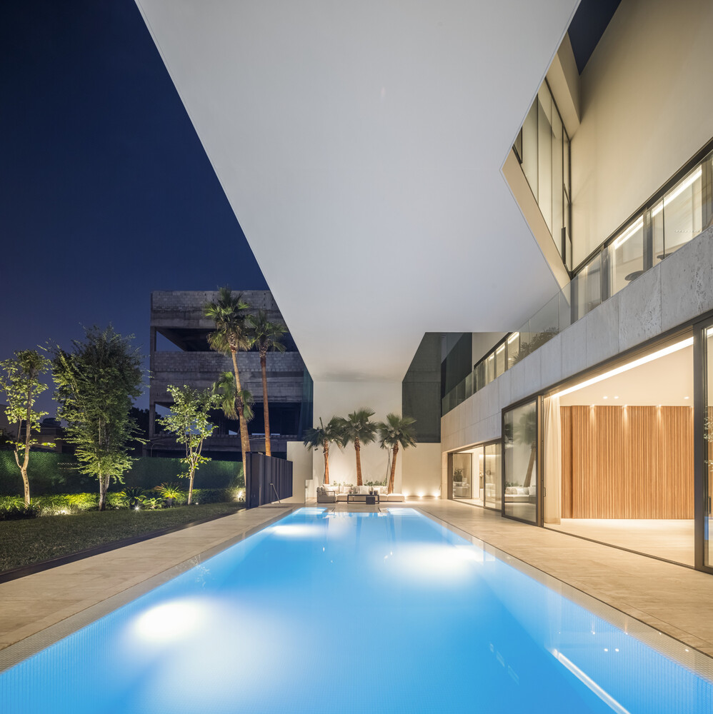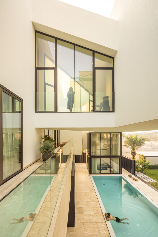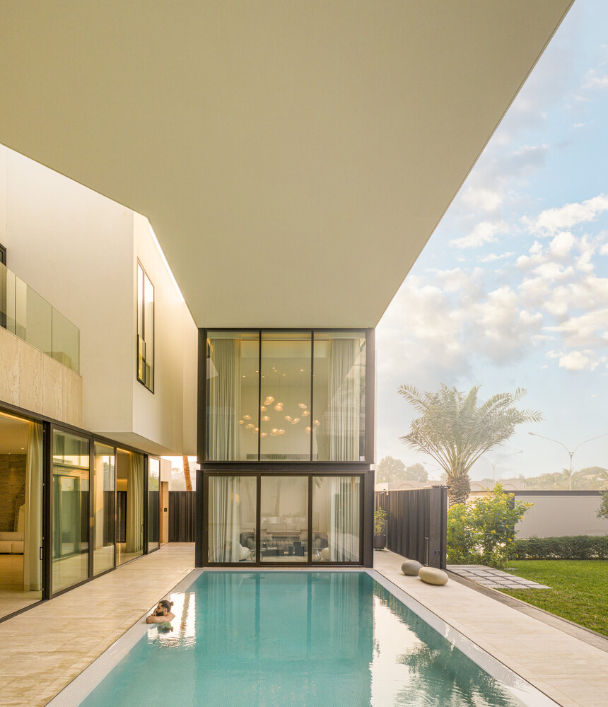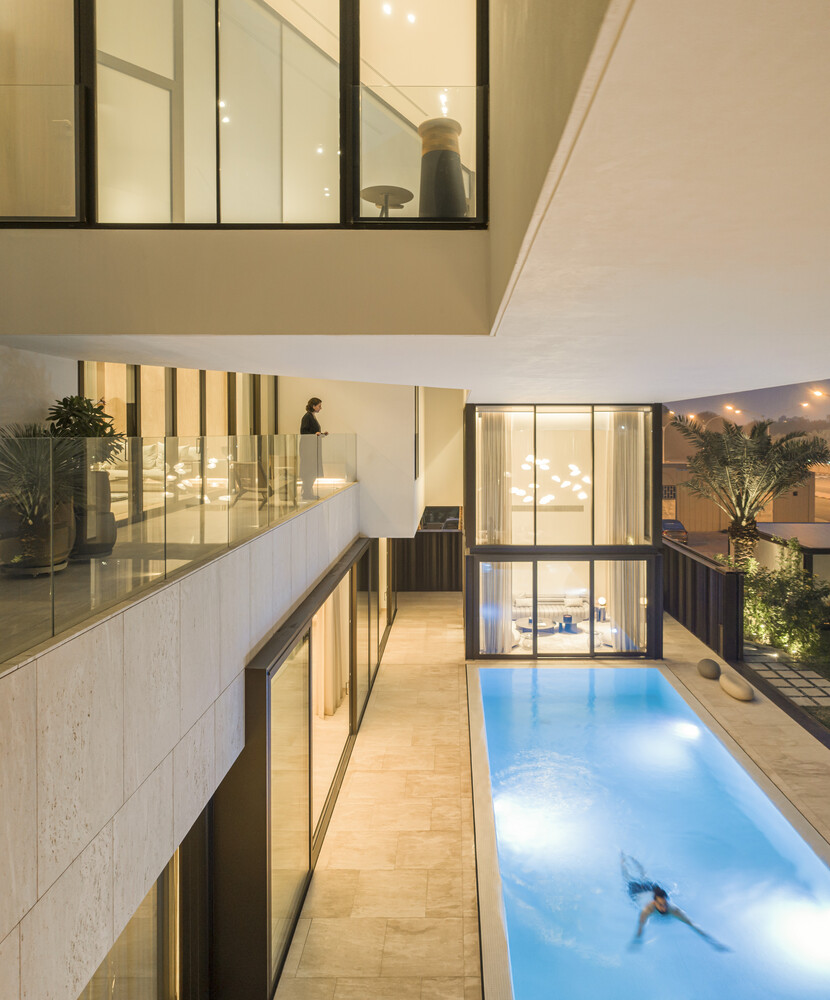 The pool, located within this framework, benefits from the portico's cover, ensuring solar control while fostering a dialogue between the interior and exterior, compressing and expanding spatial experiences.