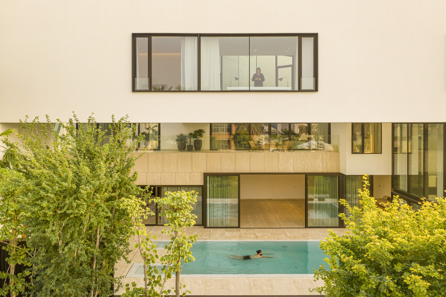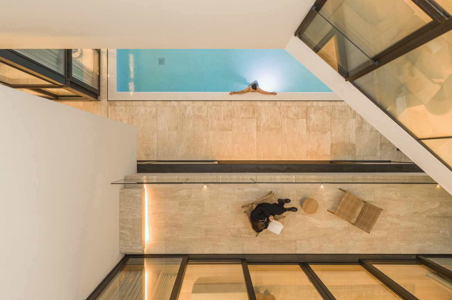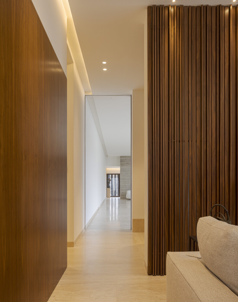 The pool, located within this framework, benefits from the portico's cover, ensuring solar control while fostering a dialogue between the interior and exterior, compressing and expanding spatial experiences.