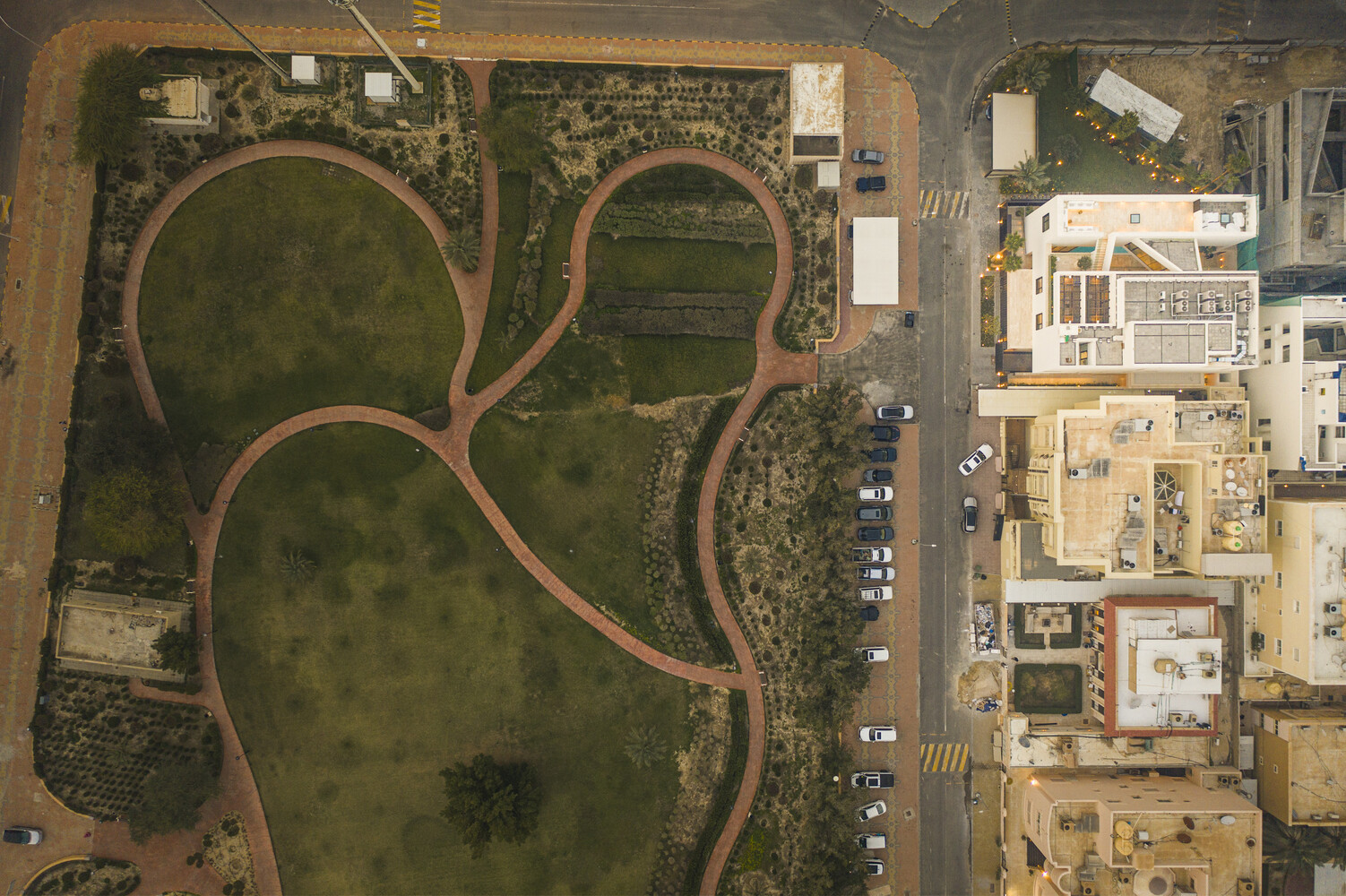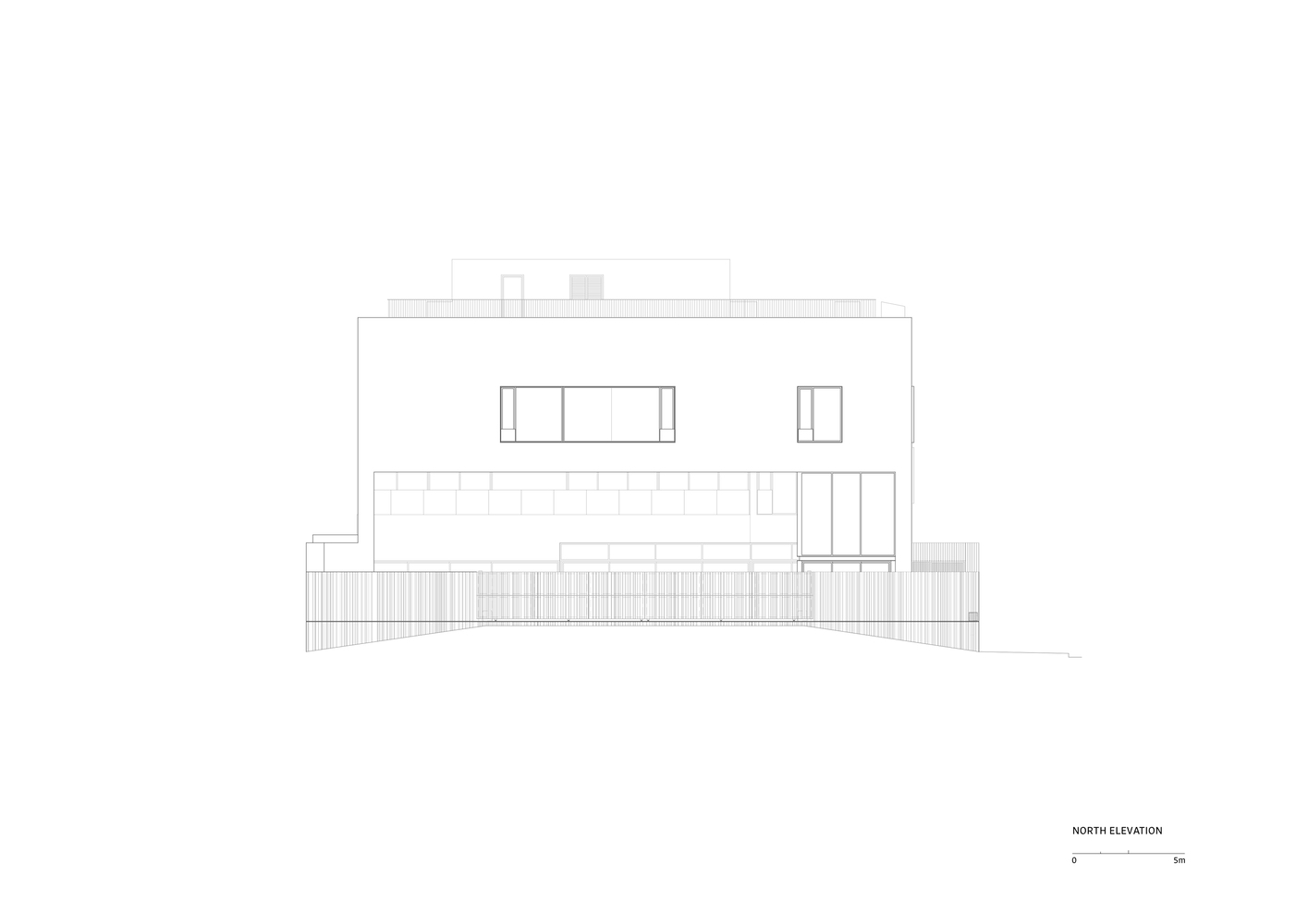In contrast, the west-facing façade, oriented towards an adjacent park, takes on a more introspective character, featuring controlled openings that balance transparency with seclusion and regulate solar exposure.