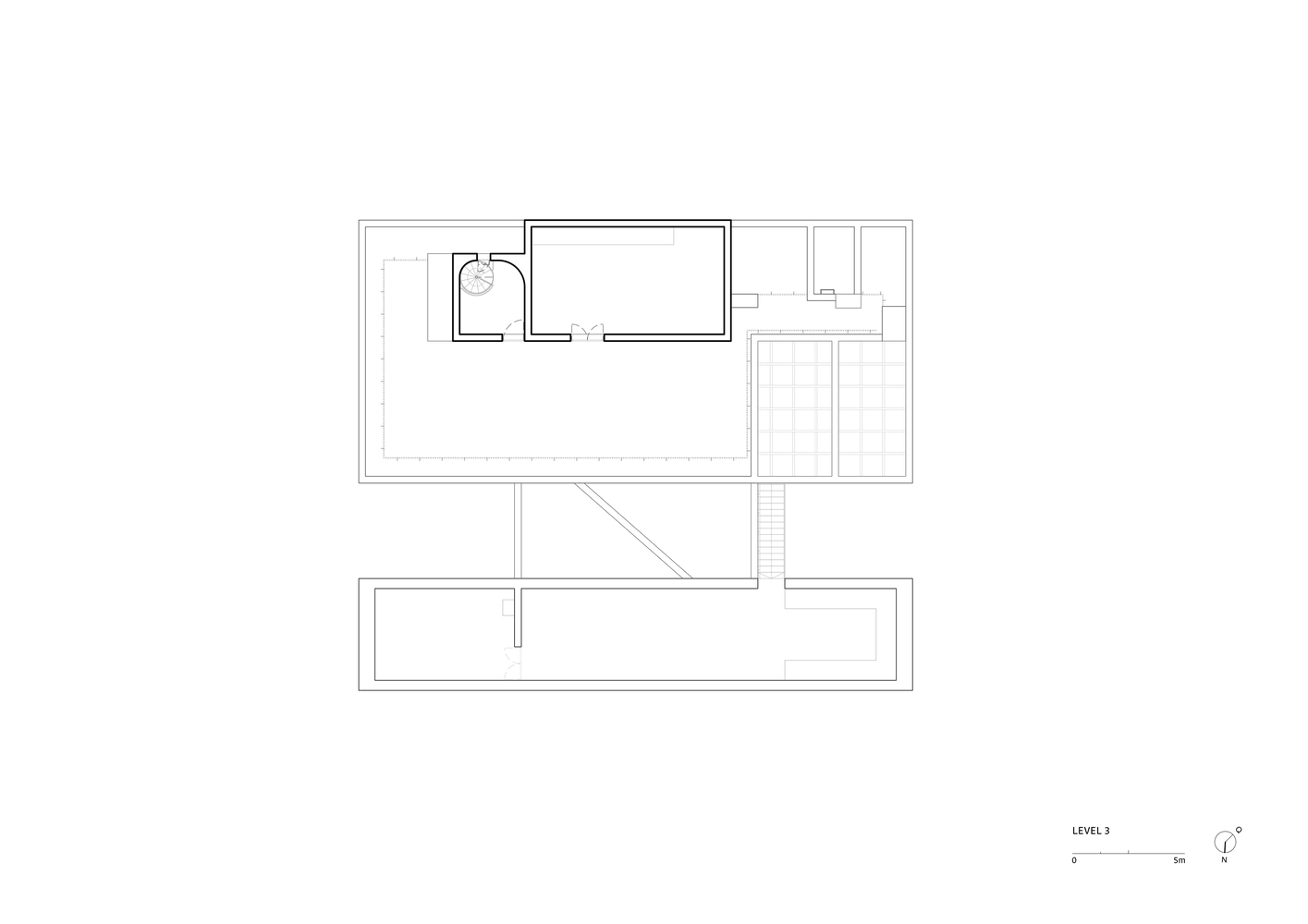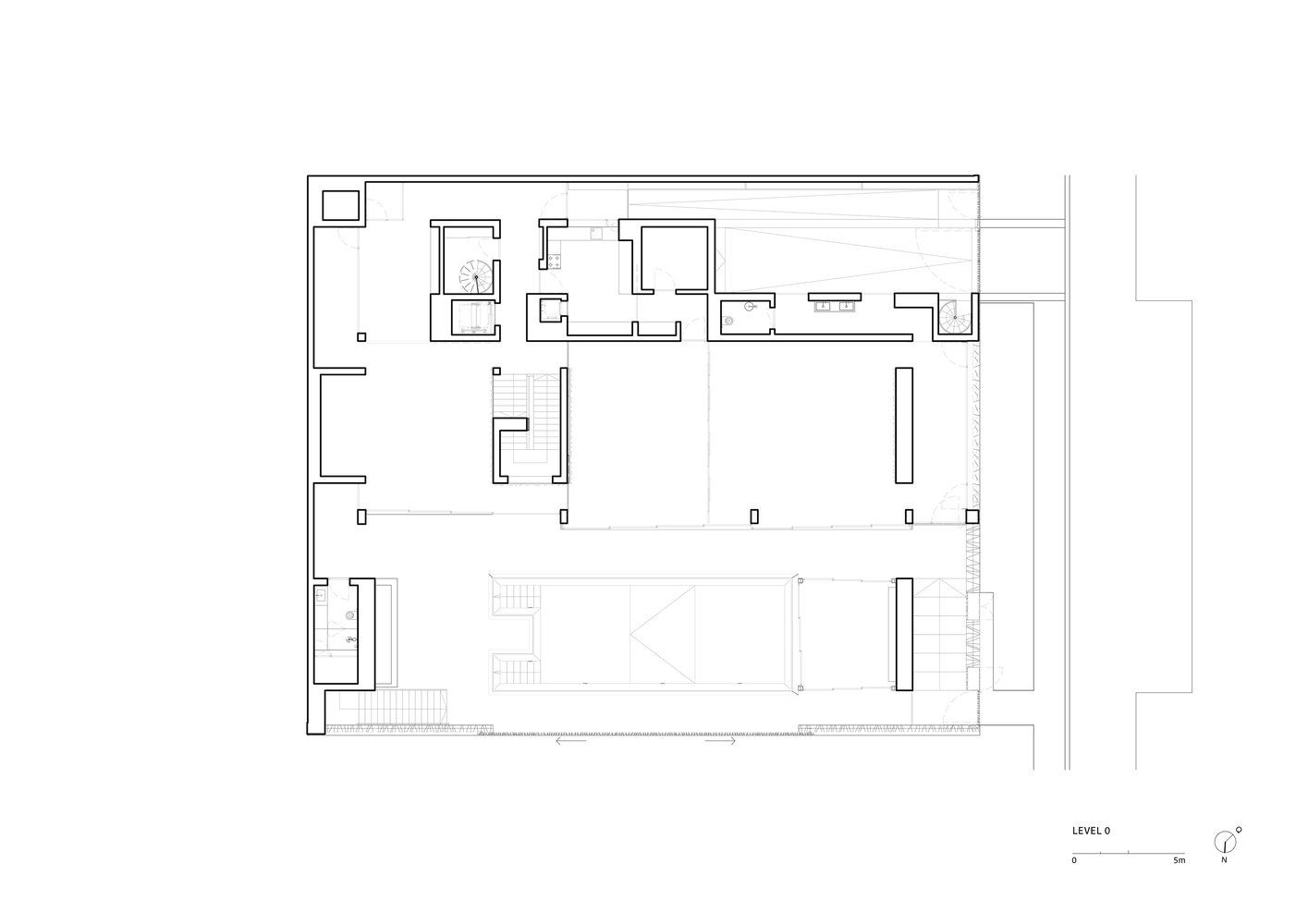 Below this, the garage, service areas, and technical spaces are integrated seamlessly into the design, providing essential infrastructure while maintaining spatial fluidity and efficiency.