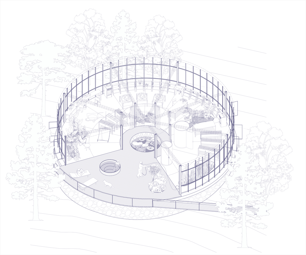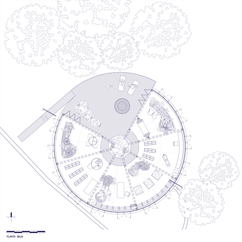 The circular surface of the pre-existence was then divided into 8 equal structural and spatial modules, two of them exterior and six interior.