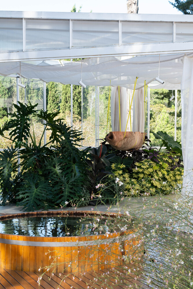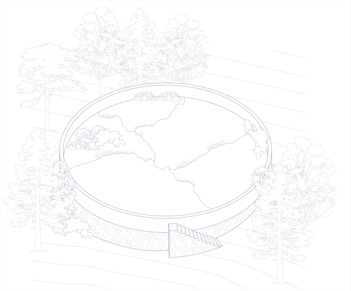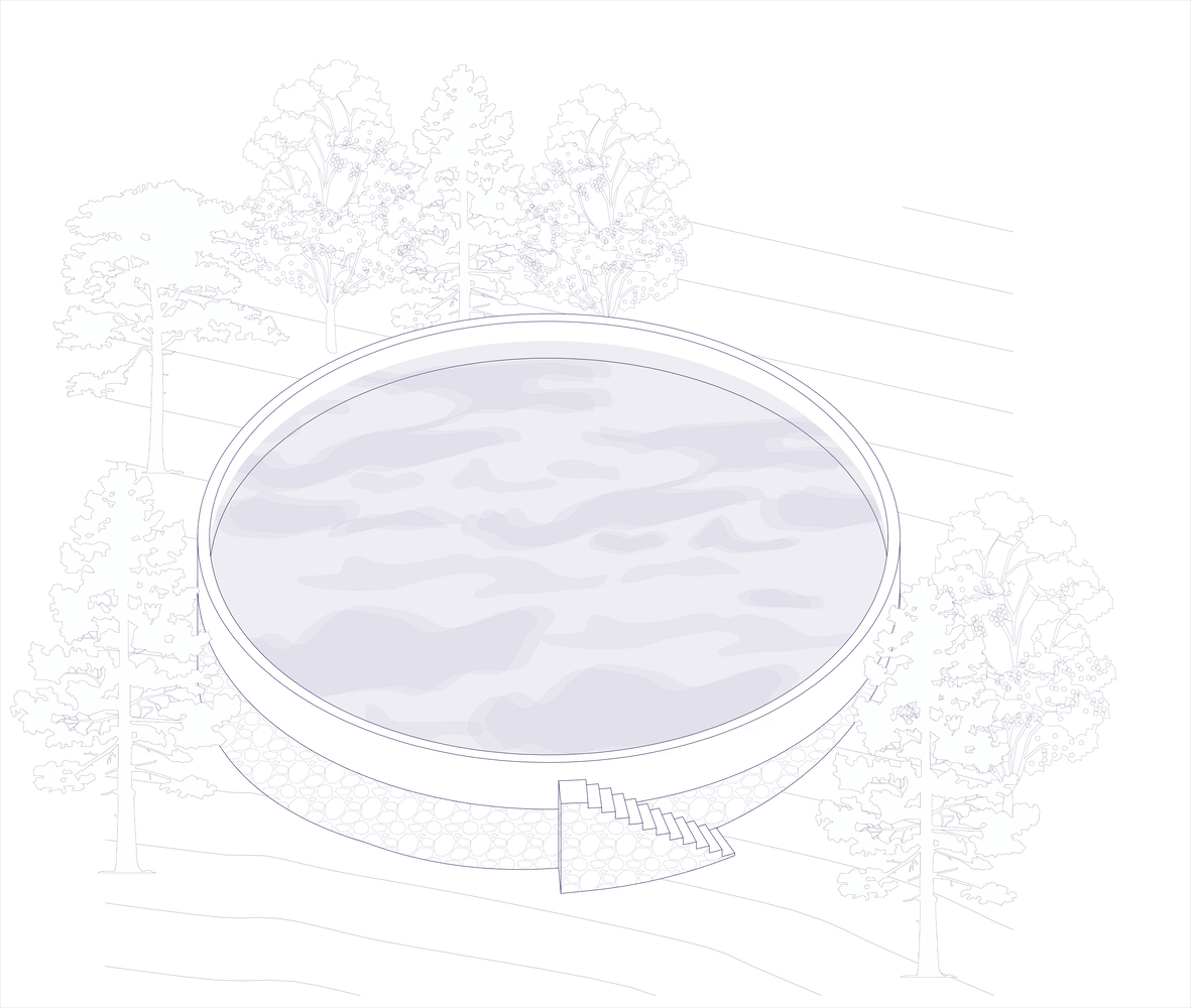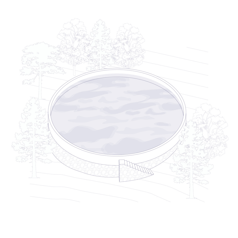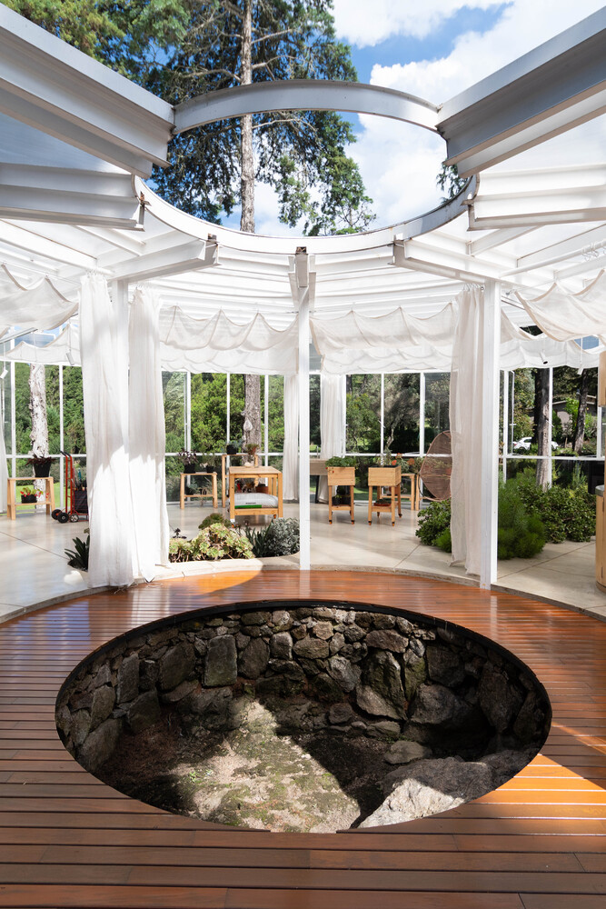 Alluding to the impluvium of Roman houses, the inverted roof is emptied in the center to collect rainwater in a natural pool that drains through a rocky callosity.