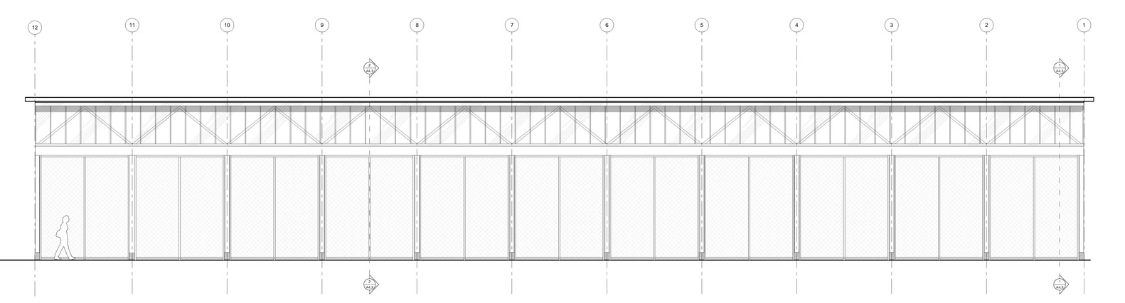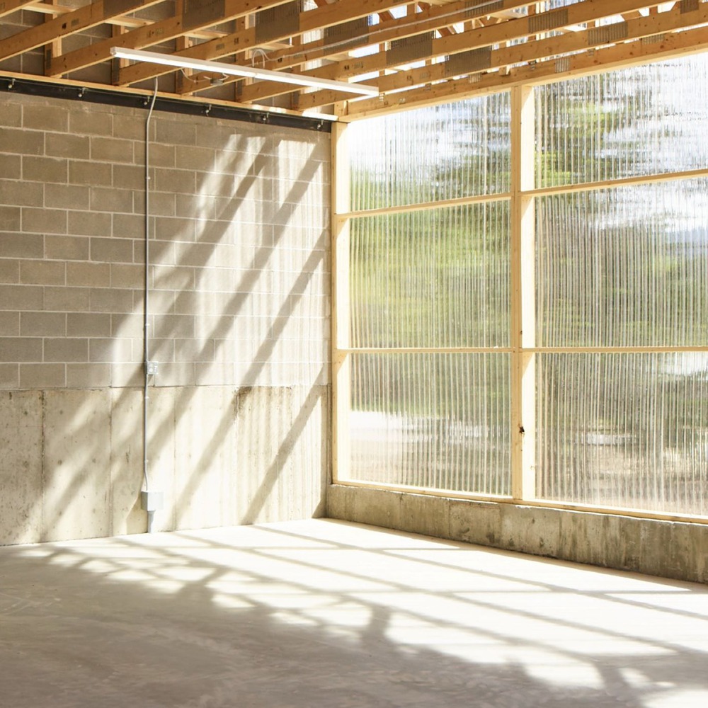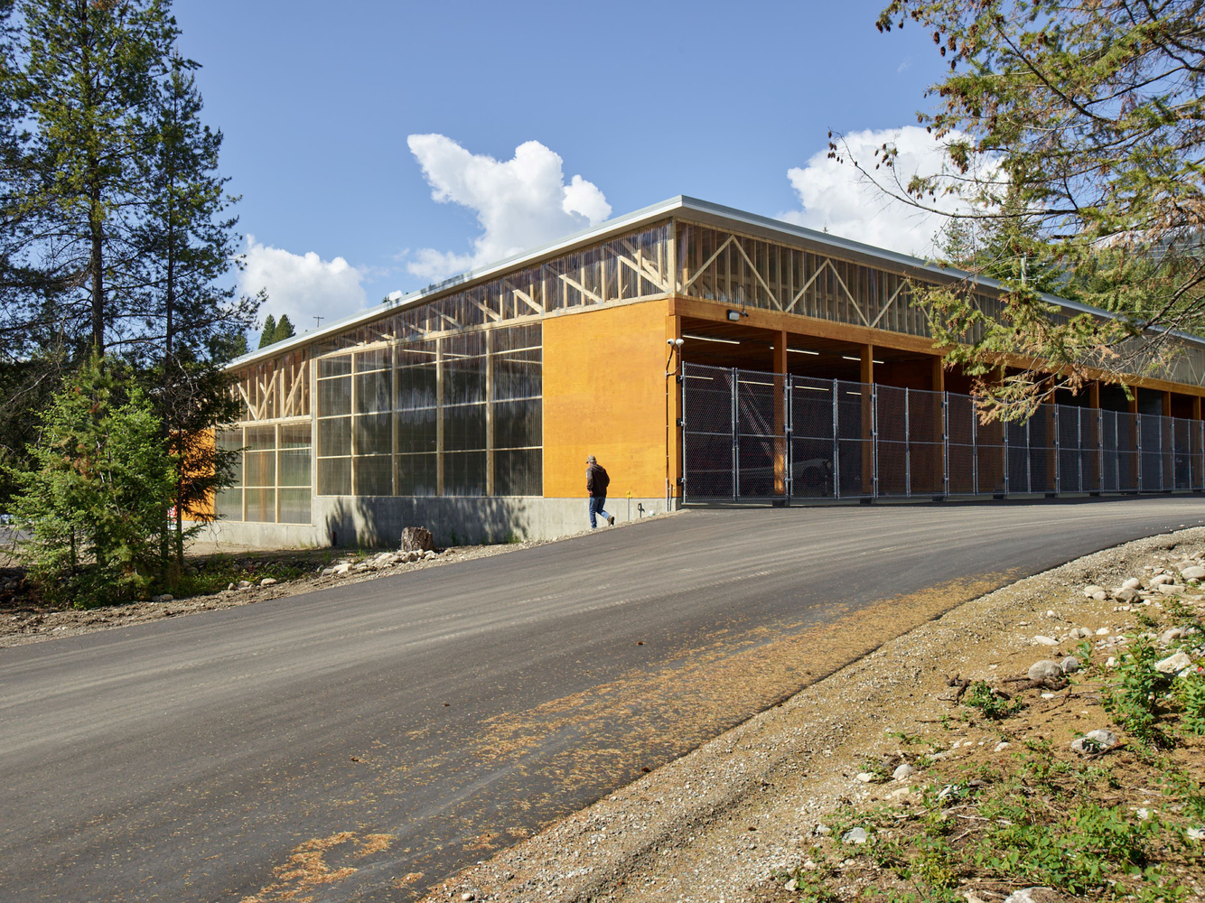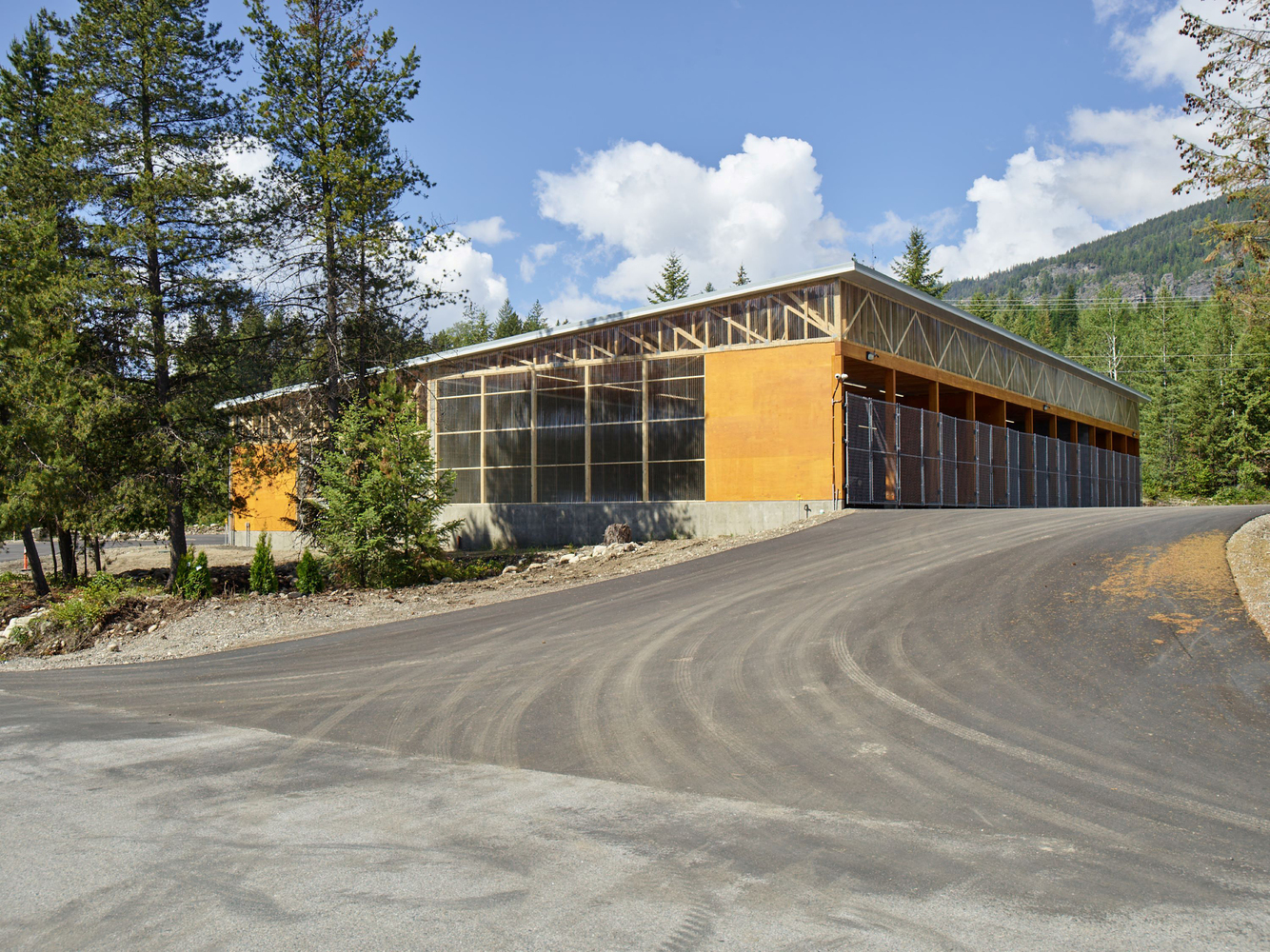 Translucent polycarbonate panels protect from rain while inviting natural light deep into the interior. Vehicle stalls are secured by chain link gates and divided by stand-alone shear walls.