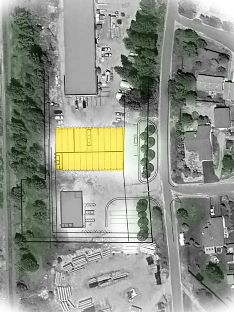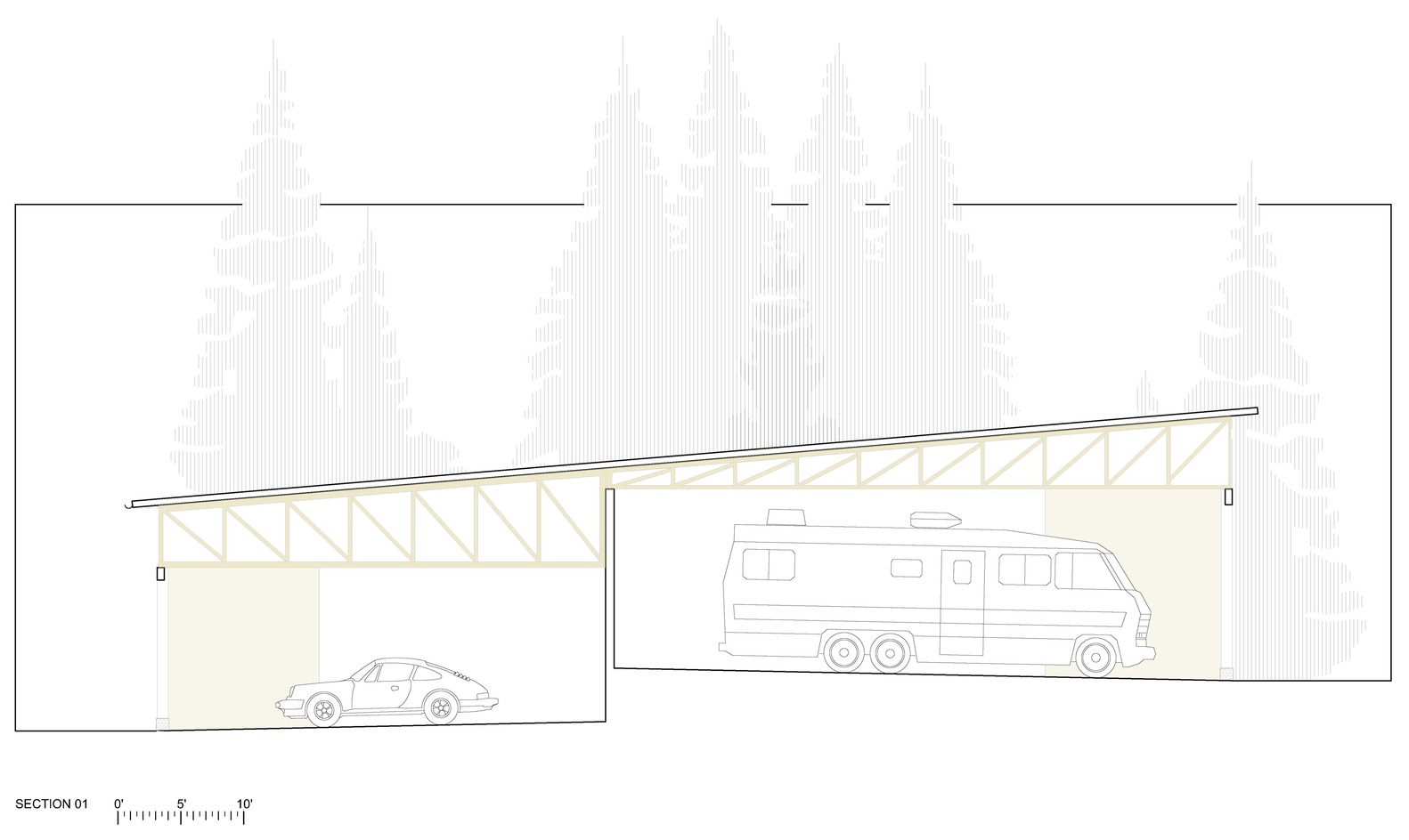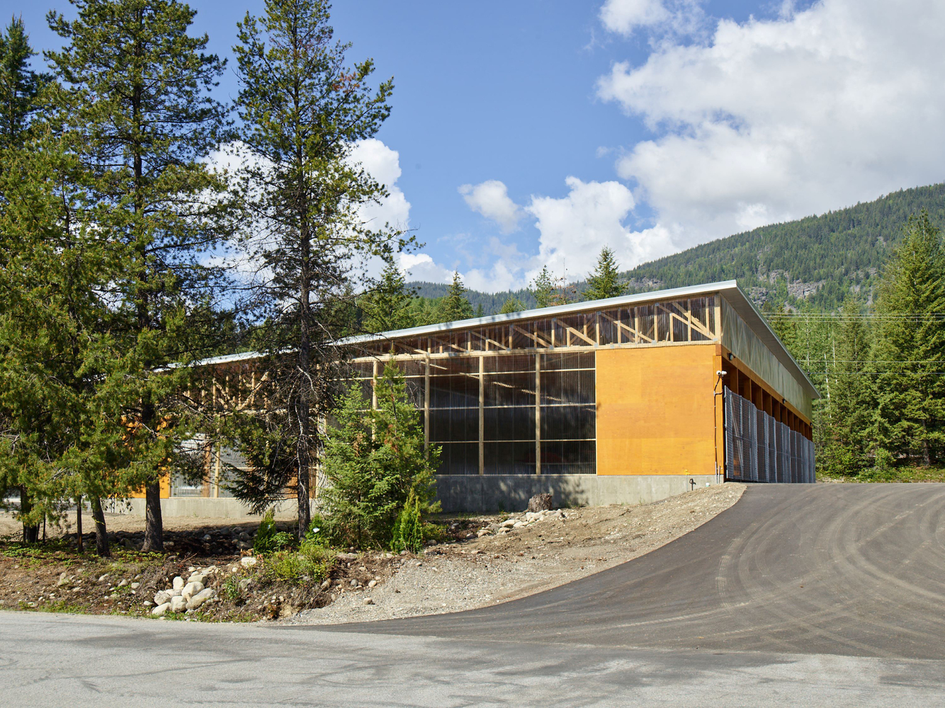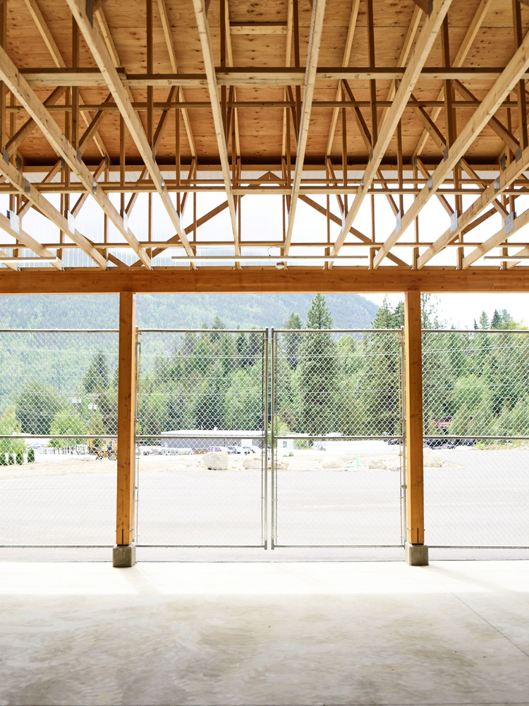 The building adopts a timber post-and-beam framework that supports a broad, wood truss roof. This roof shelters 21 rental stalls to store recreational vehicles, boats, vans, and trailers. The building also contains a small administrative office, a bathroom, and utility rooms.