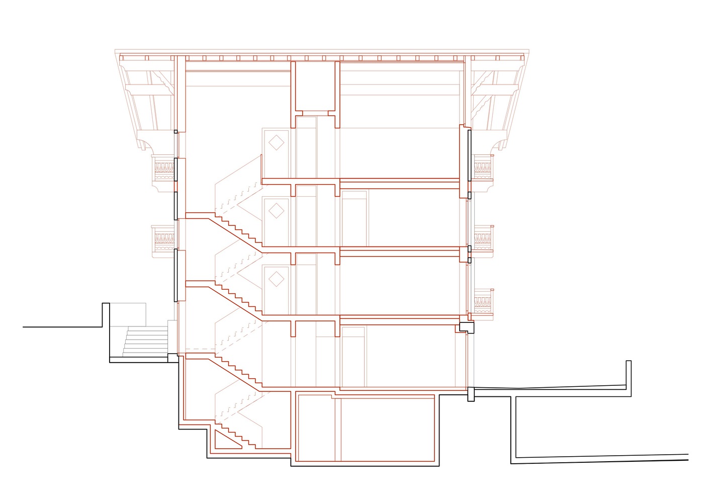Each floor is raised to provide the ceiling height required for its new administrative function.