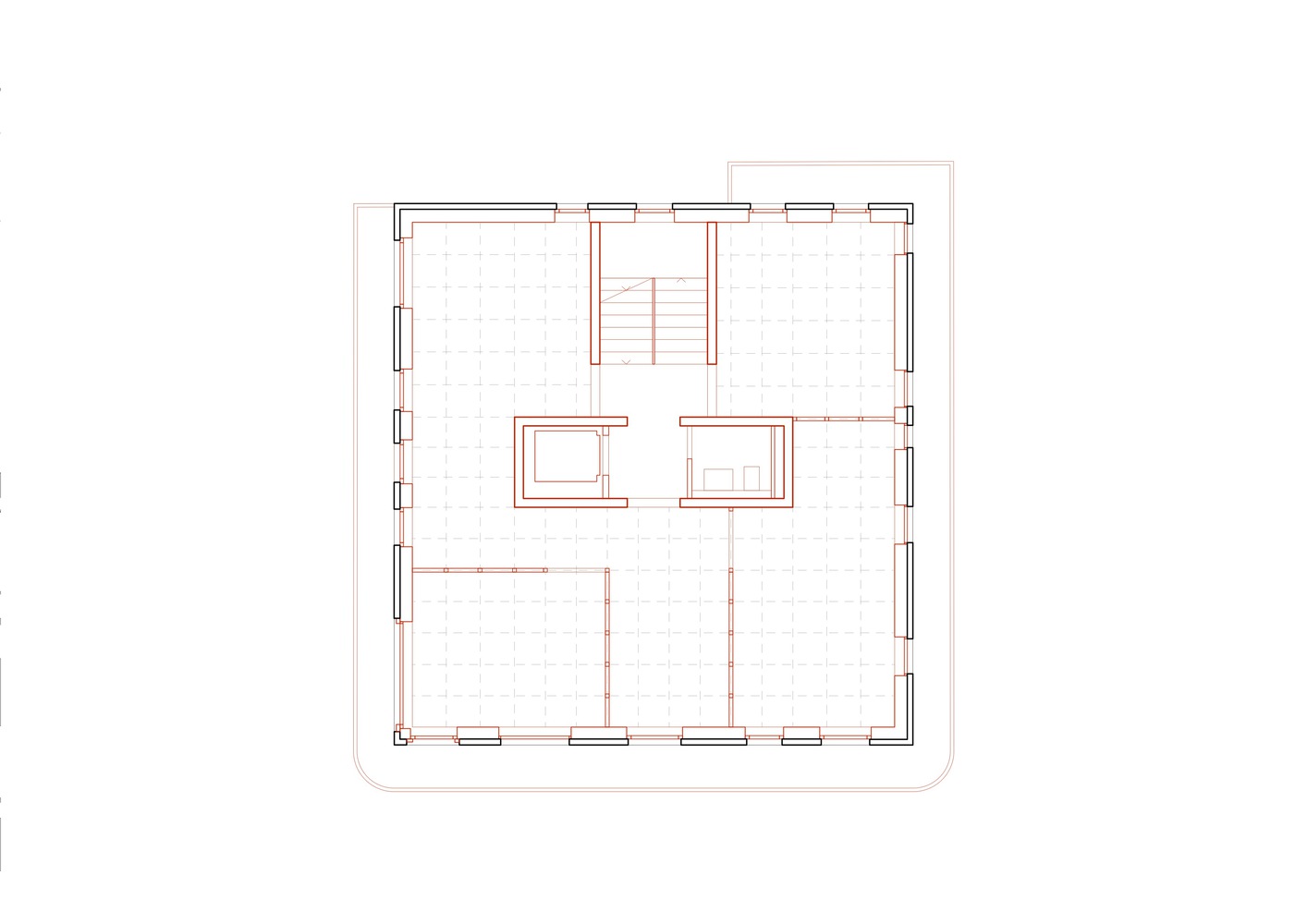 Inside, a living core emerges: a new floor slab, connected to these new timber belt structures, pays tribute to the original ceilings through a grid of technical coffered panels.
