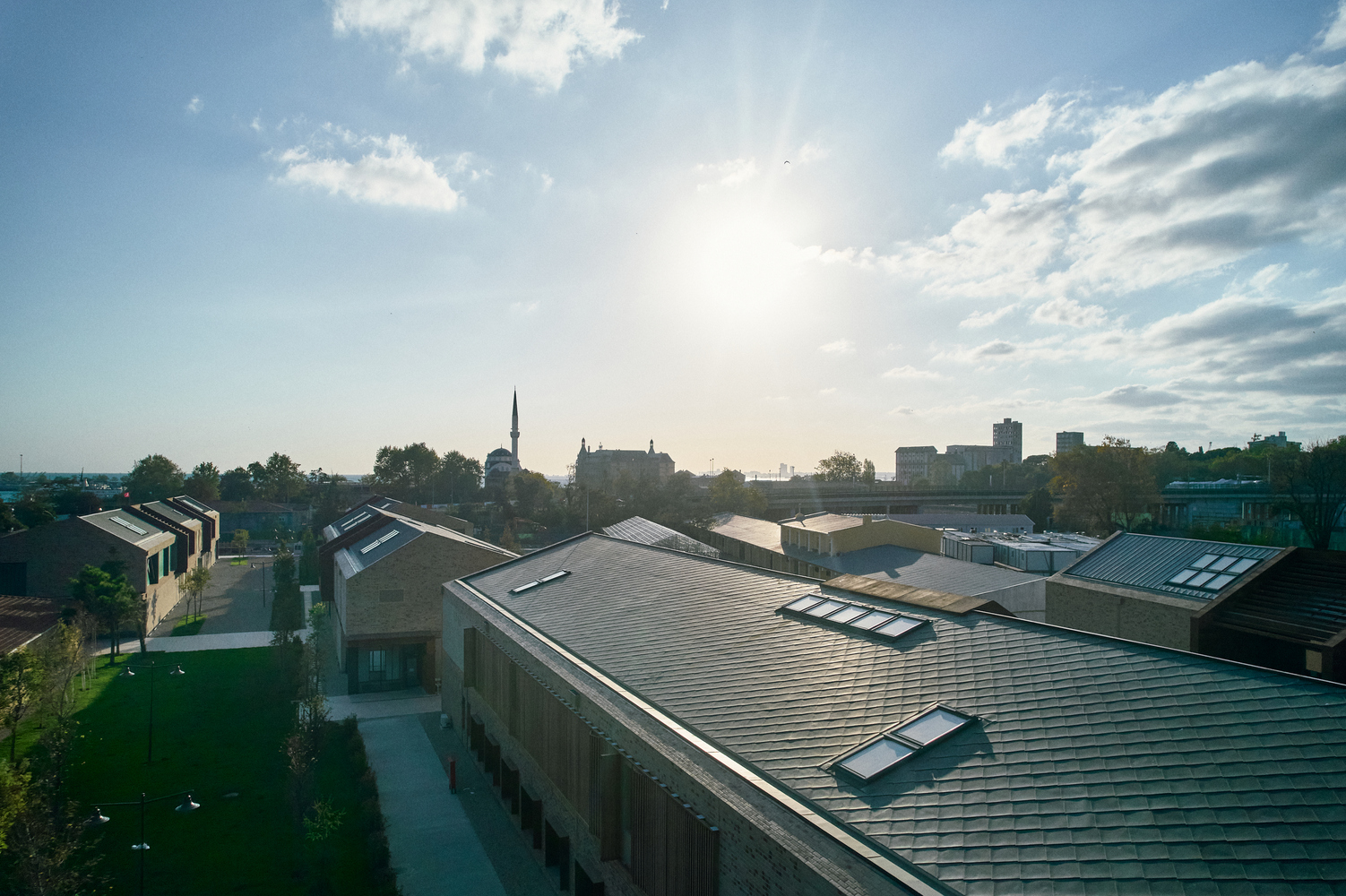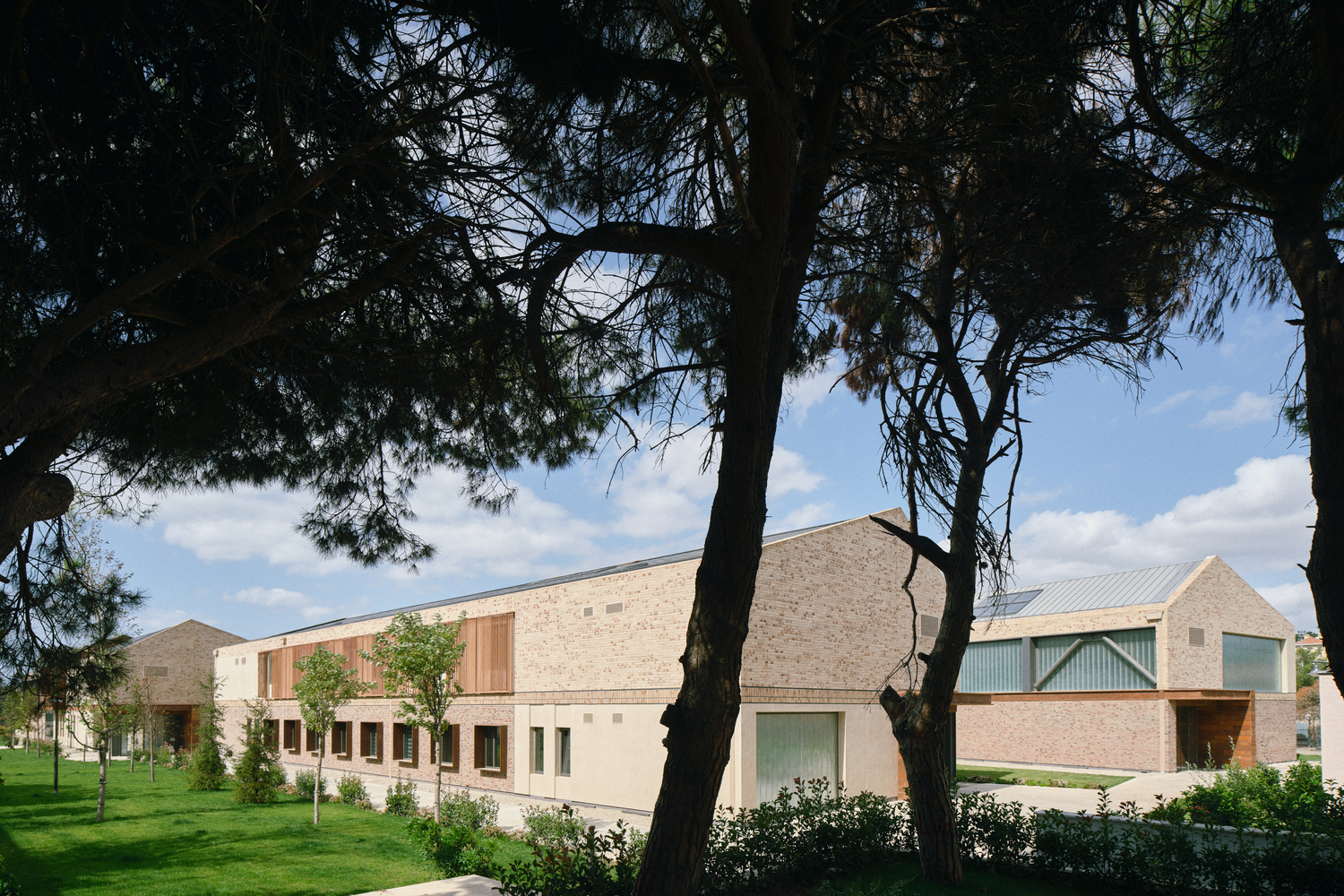 Designed with a unified architectural language, these five steel-structured buildings differ in length according to their varying structural axes. Modular segments composed of different mass and material combinations are arranged side by side according to daylight and interior spatial requirements.