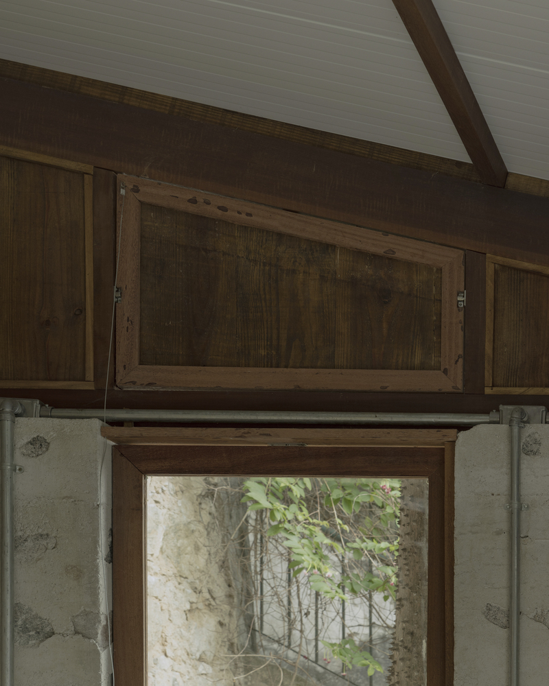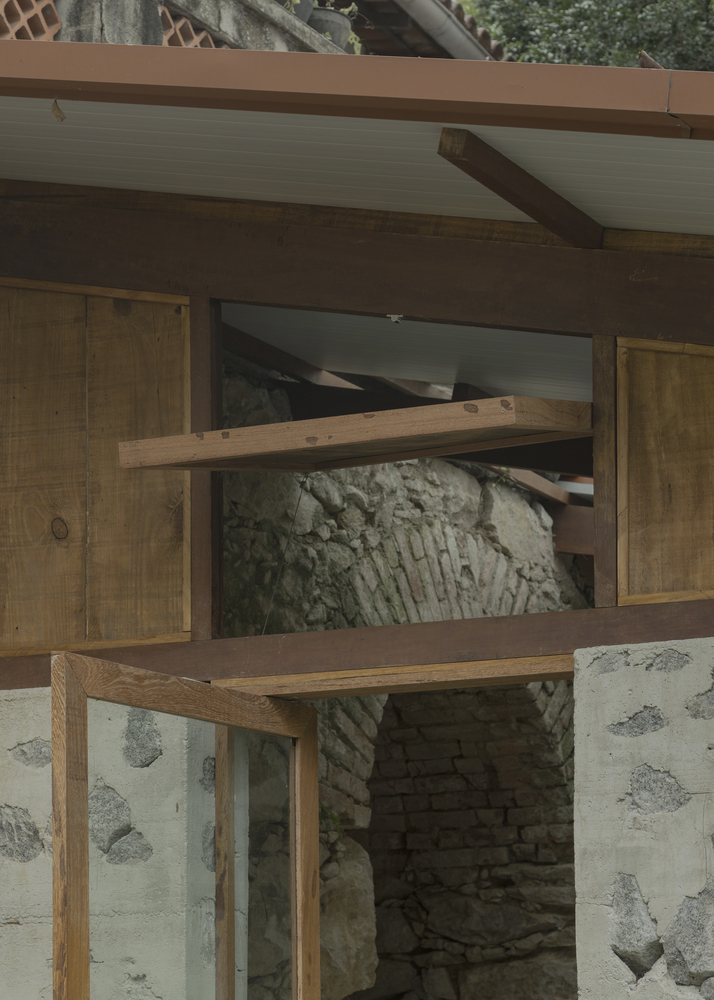 Wooden boards initially used in the forms of the cyclopean concrete panels were repurposed in the closures of the corners, reinforcing material coherence and respect for the existing construction context.