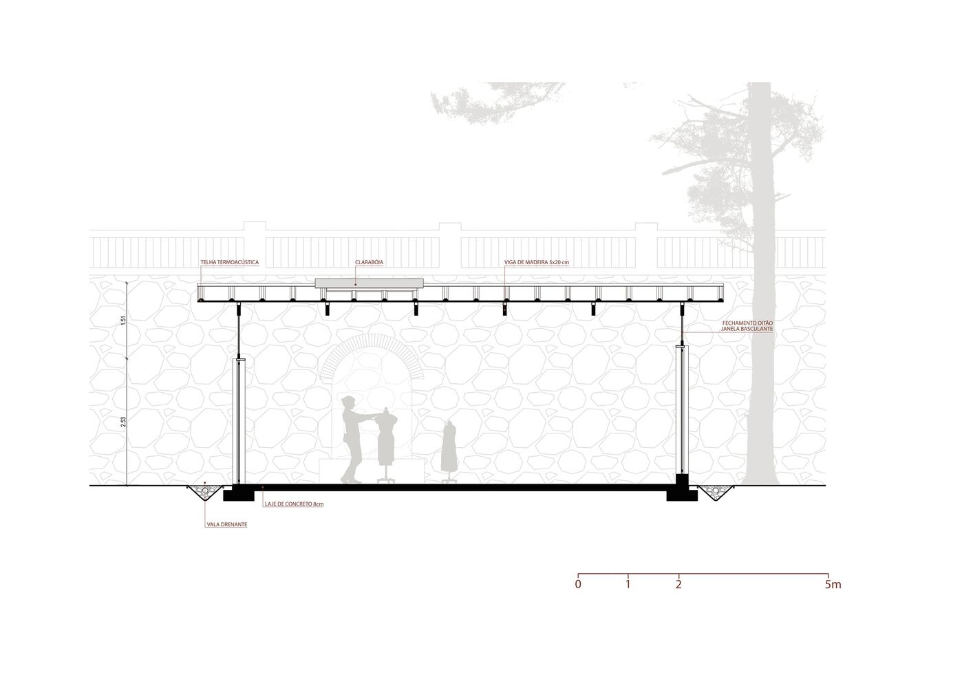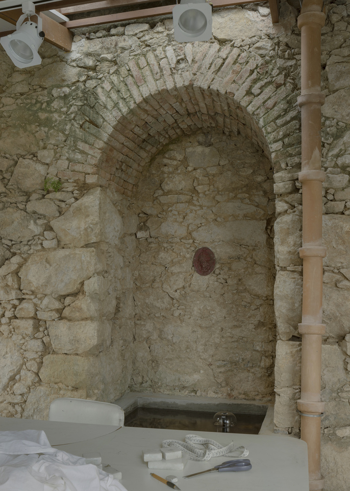 Thermal-acoustic tiles and a skylight, illuminating an old fountain recovered in the stone wall, accentuate the possibility of coexistence between historical memory, craftsmanship, ancestral making, and constructive innovations.