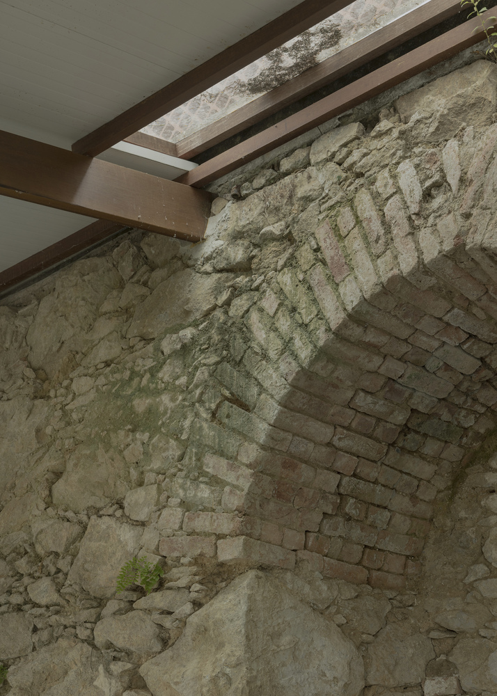 Cyclopean concrete panels and wood are the elements composing the structures, harmoniously integrating with the historical and local context, dialoguing with the existing wall and forming closures that provide structural resistance and plastic identity.