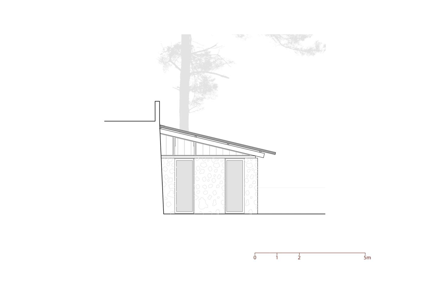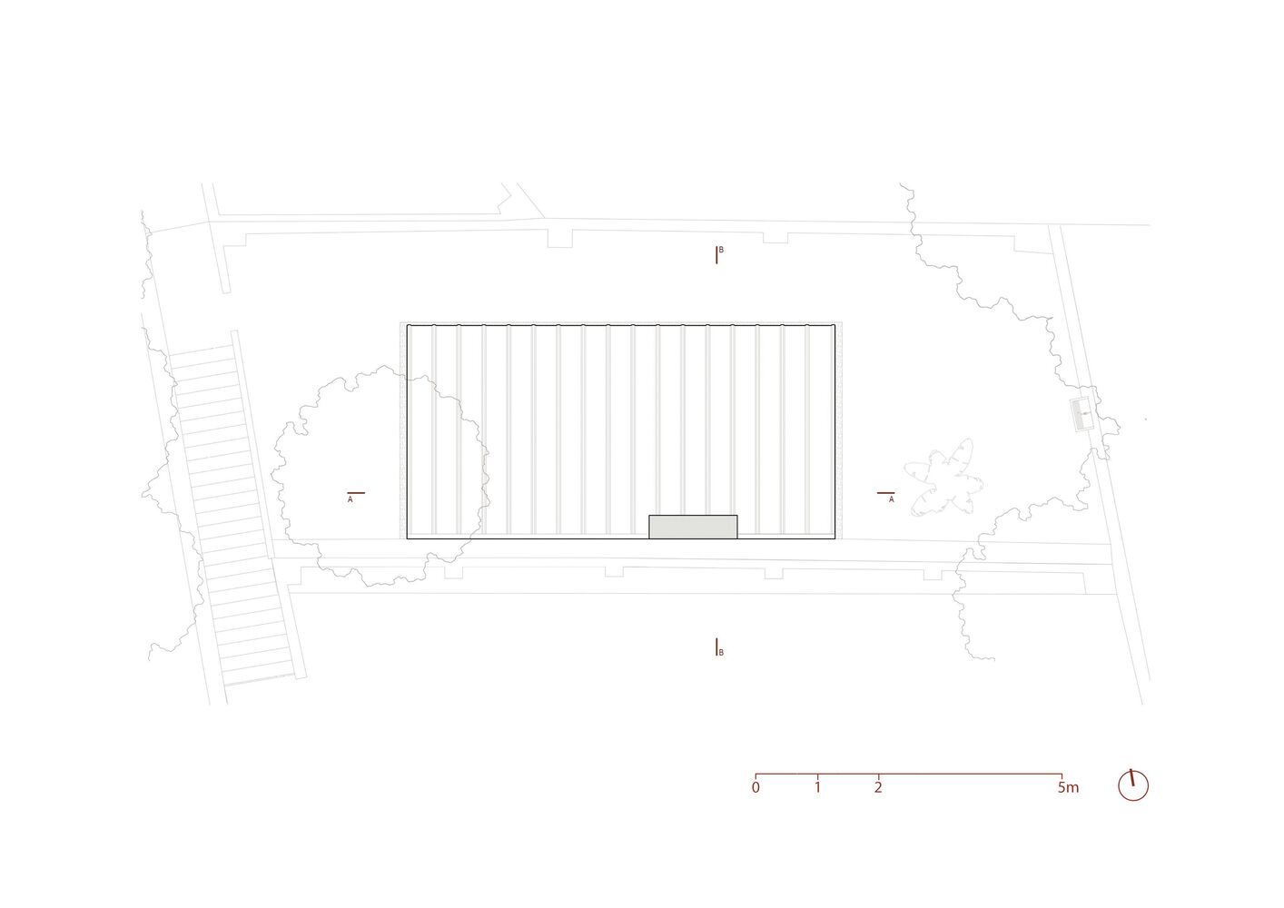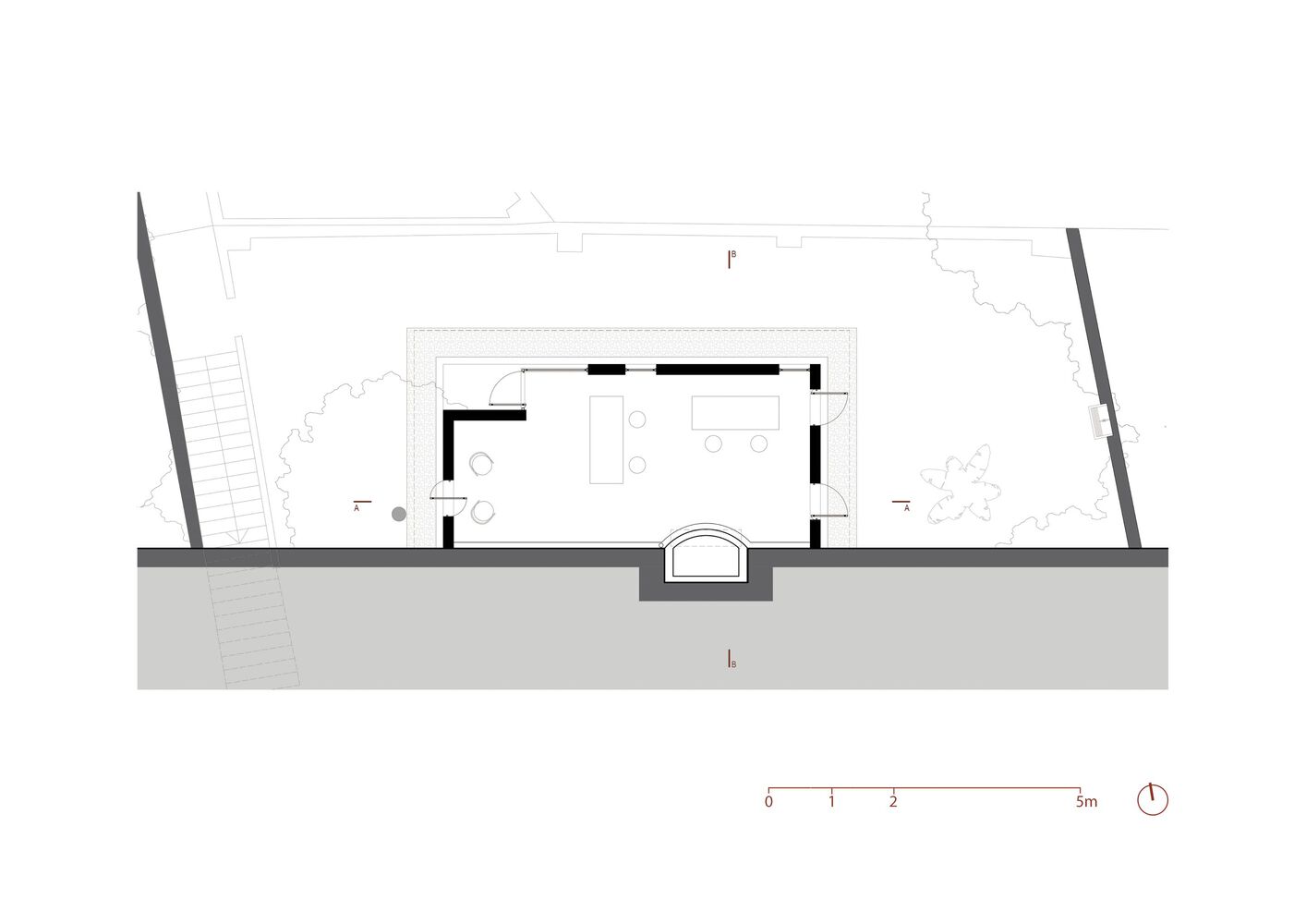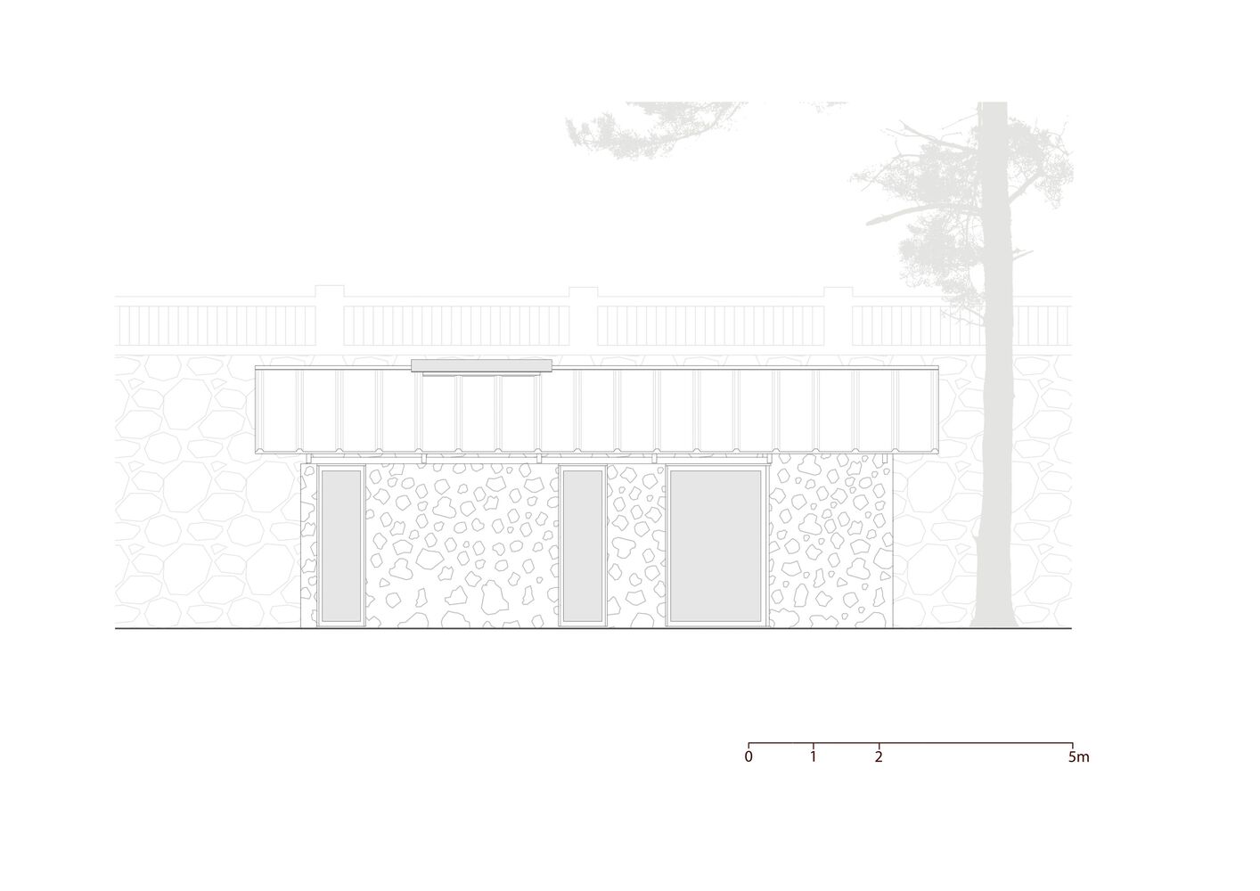 This pre-existing structure establishes the architectural concept, serving both as a physical boundary and structural support for the new intervention.