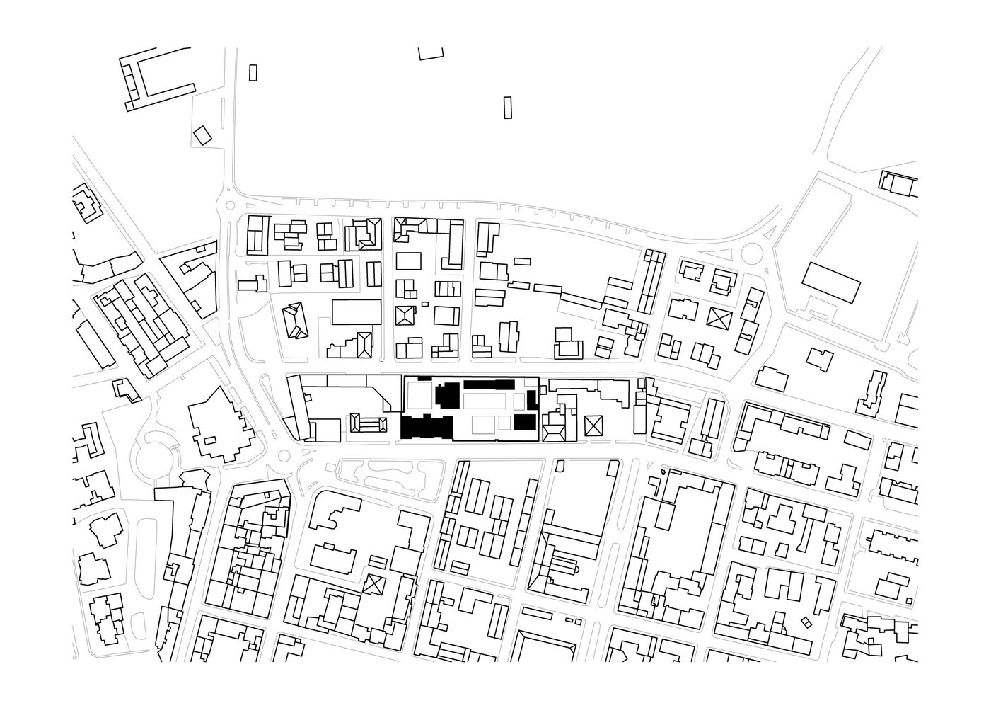 The proposal is grafted onto a diverse set of buildings and a previously undefined open space, transforming them into a coherent, recognizable, and distinctive system.