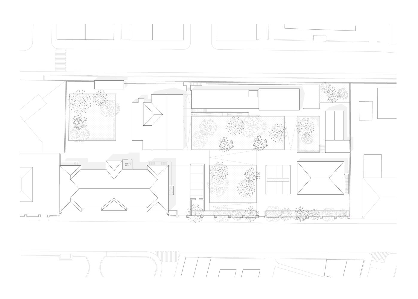 Greenery becomes an active part of the composition, helping to define a new porosity between the Academy and the city, between the institution and everyday life.