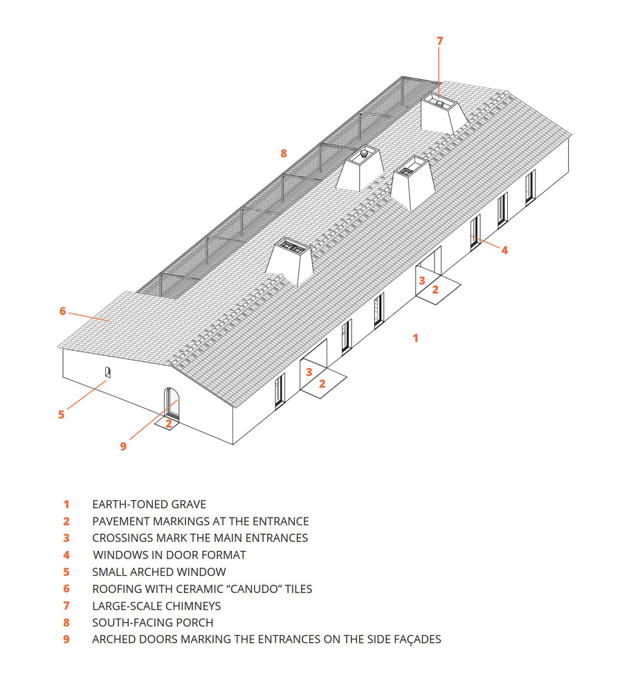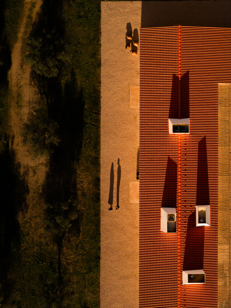 The pitched roof with ceramic tiles, whitewashed walls, thick masonry, and chimneys evoke the constructive memory of the region and assume it in the present.