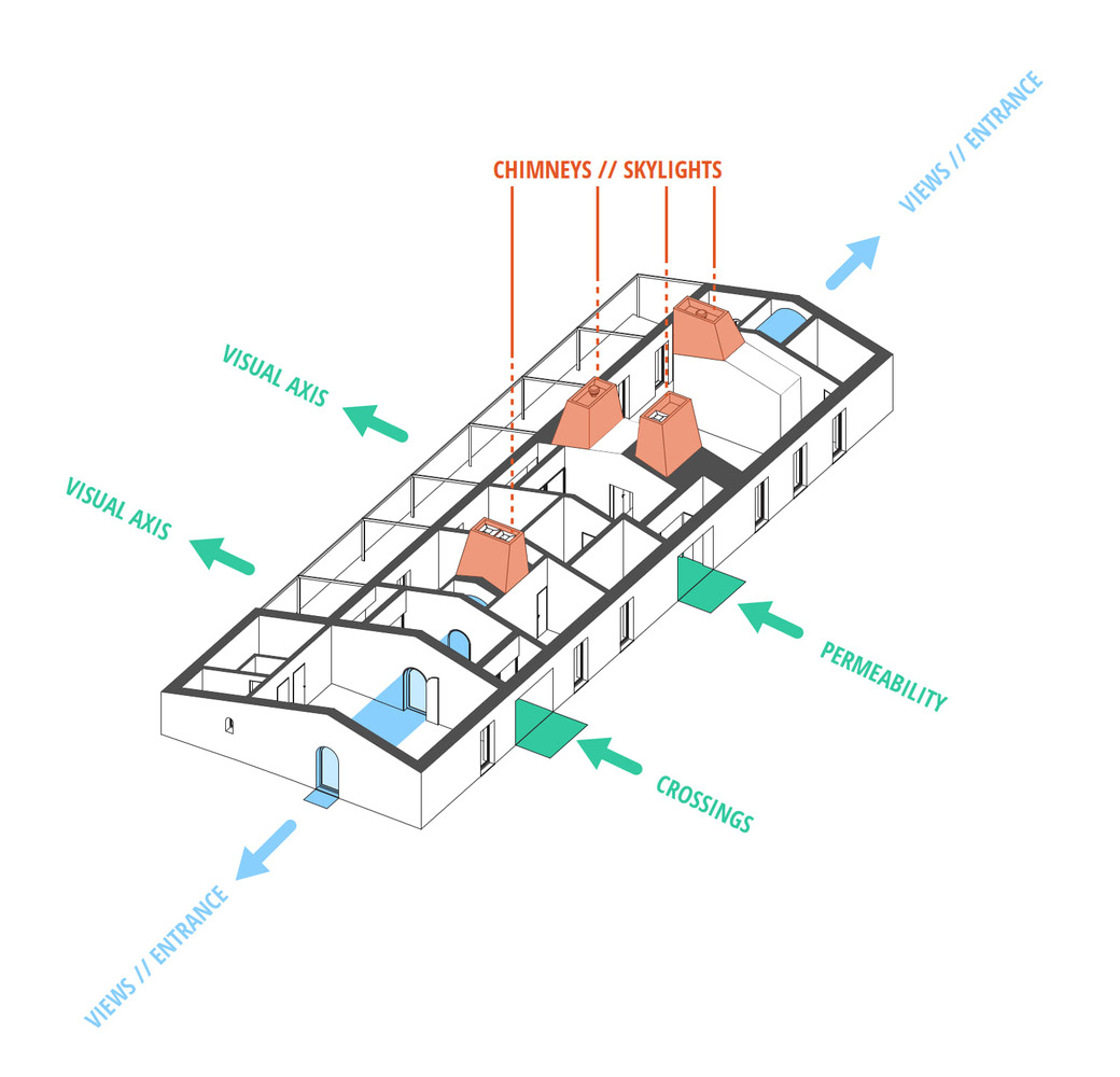 The oversized chimneys, central to the identity of the house, go beyond their smoke-extraction role: they also enable natural ventilation, foster passive cooling, and introduce diffuse zenithal light, reducing reliance on artificial systems.