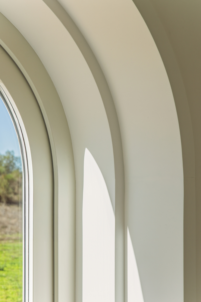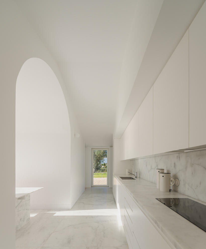 A longitudinal axis runs through the house, connecting side façades and internal wings. In the kitchen, the arch extends into a curved ceiling, adding continuity to the spatial sequence.