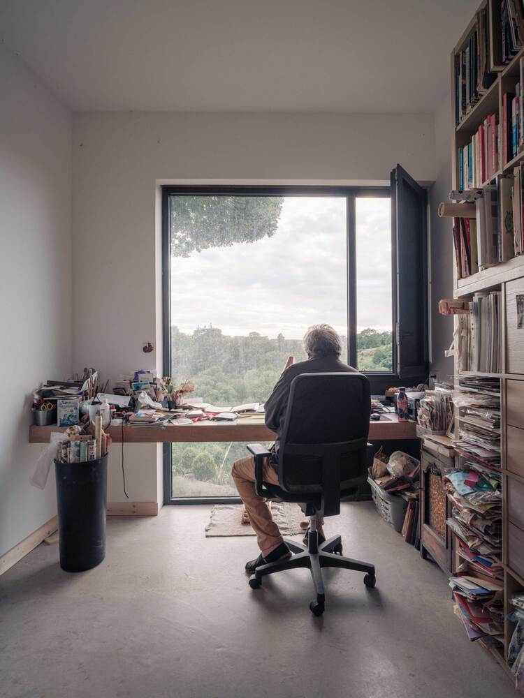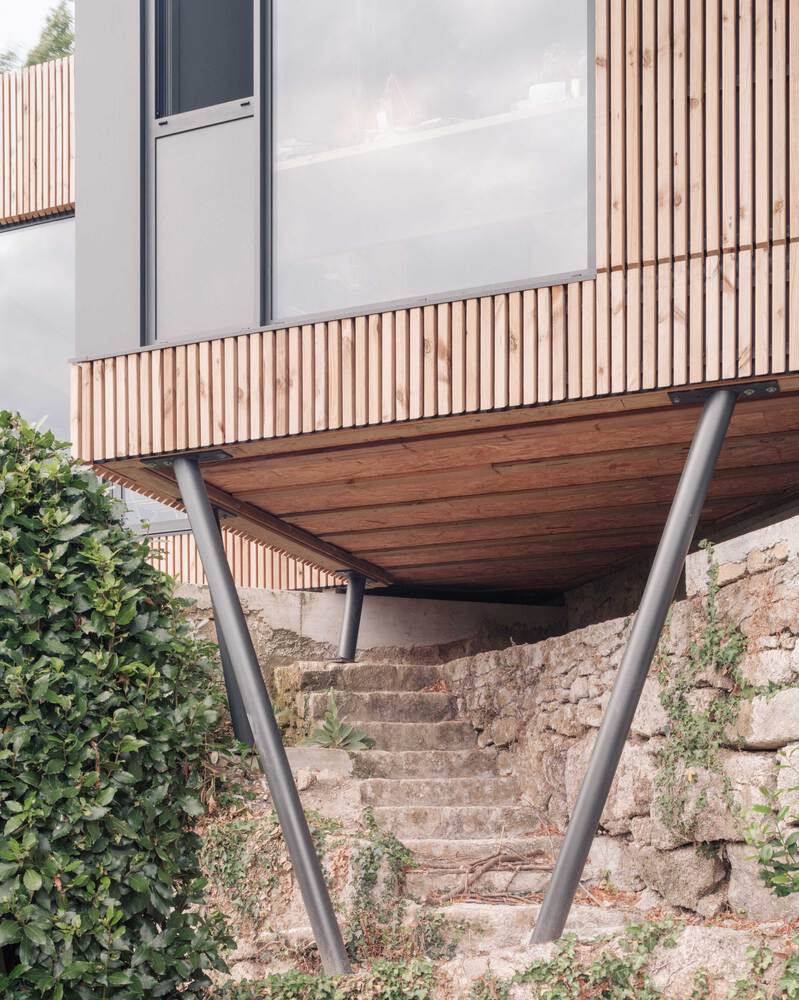 On stilts, the new volumes ride the slope and open toward the wooded hillside and the Sèvre Nantaise river below. Each step calibrates relation: old to new, inside to garden, near to distant view.