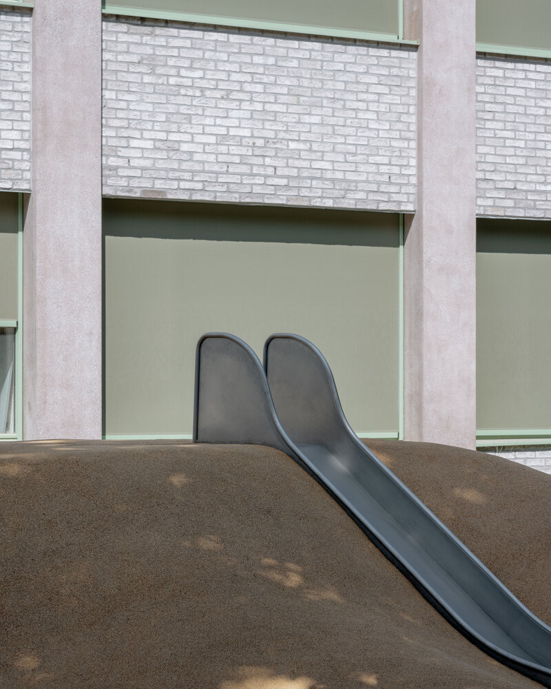 At the same time, the schoolyard was rethought as a key part of the project. Once a sealed and monotonous surface, it is now permeable, green, and diverse in uses.