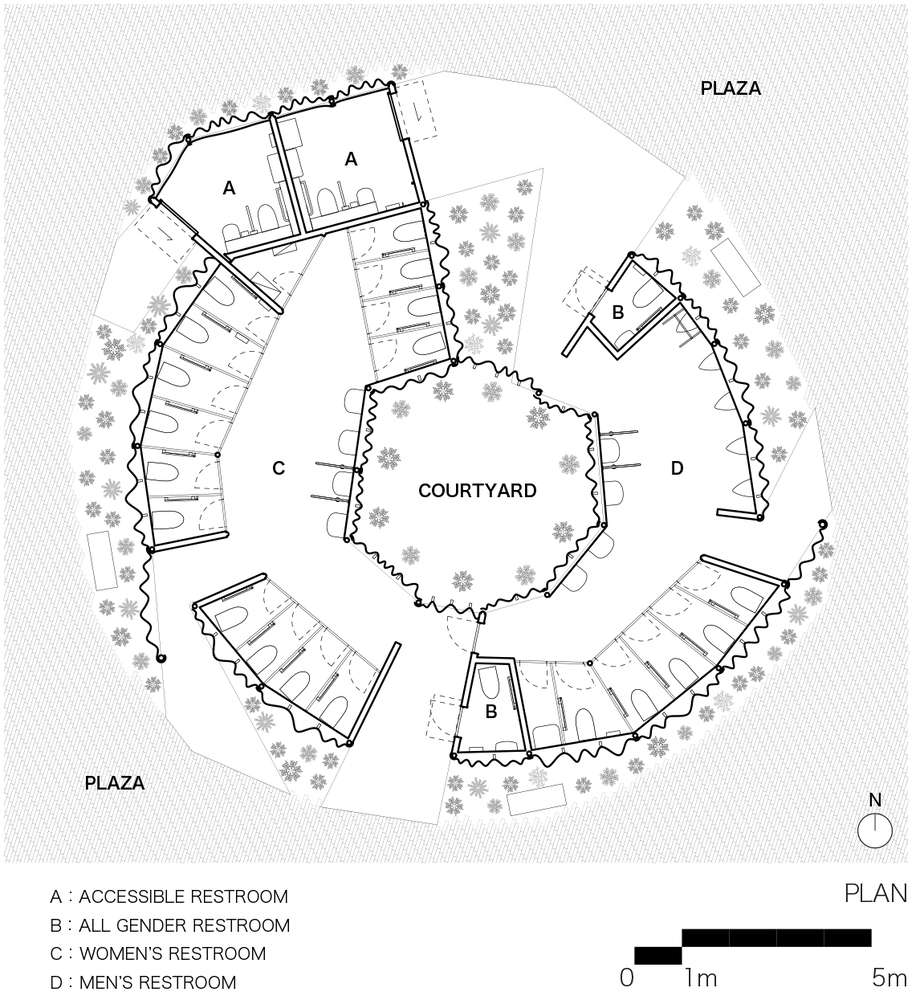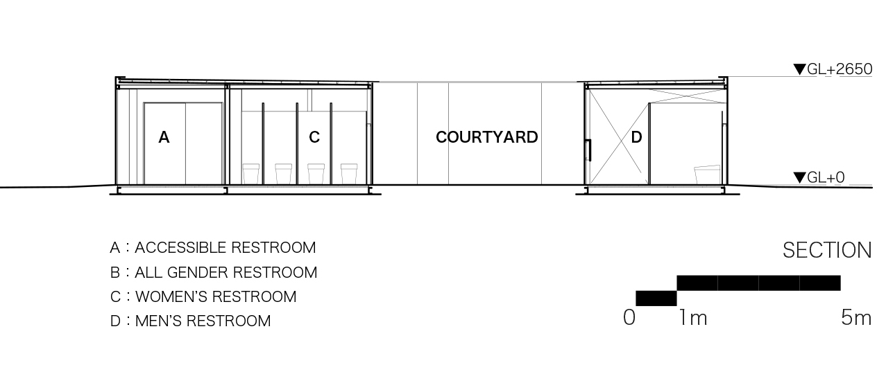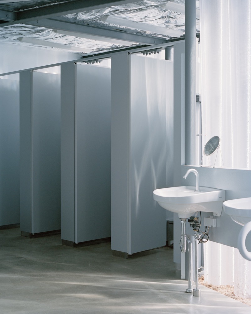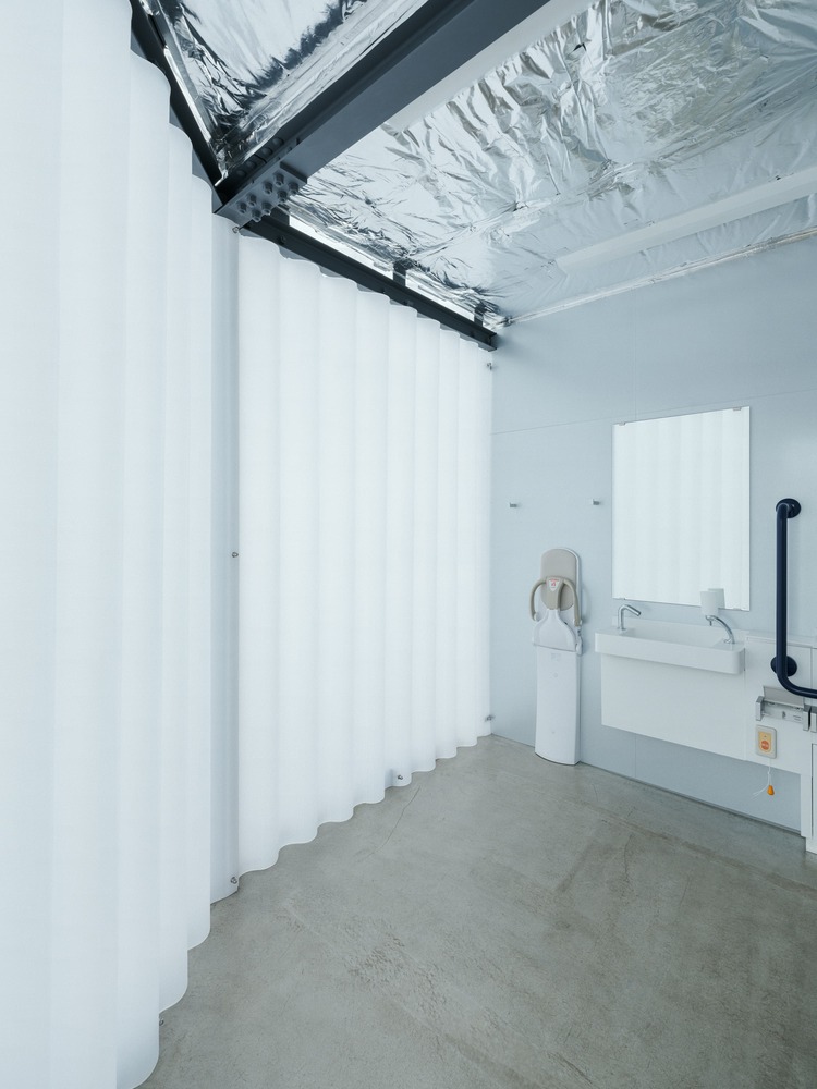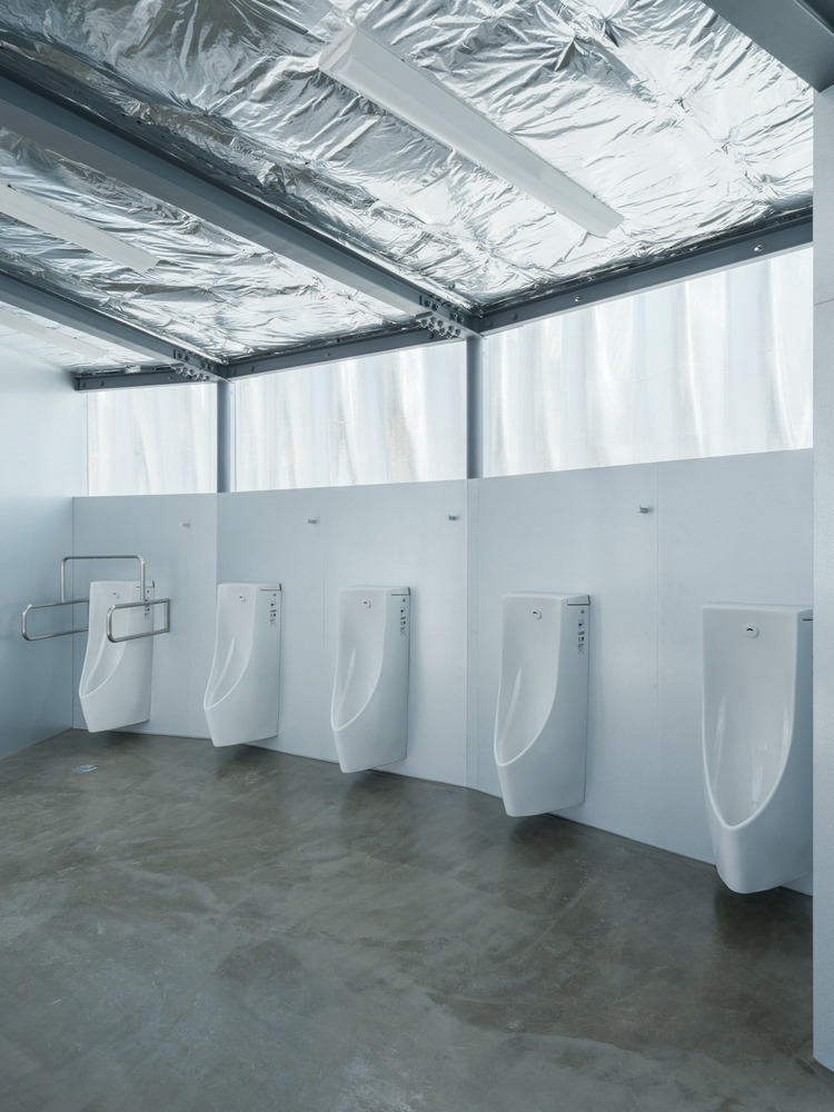 As a restroom located in a highly open environment, the aim was to achieve a space that is both bathed in light and carefully considers the need for privacy.