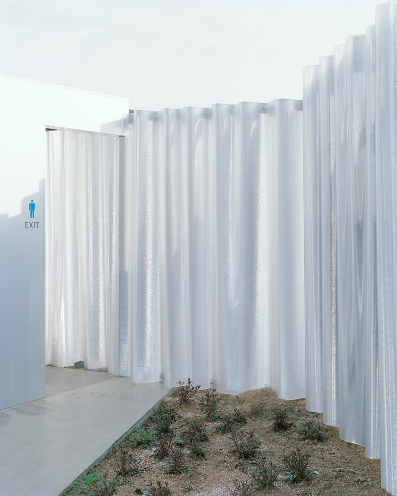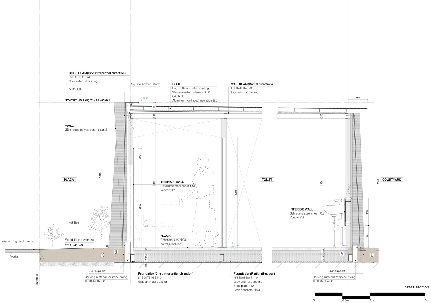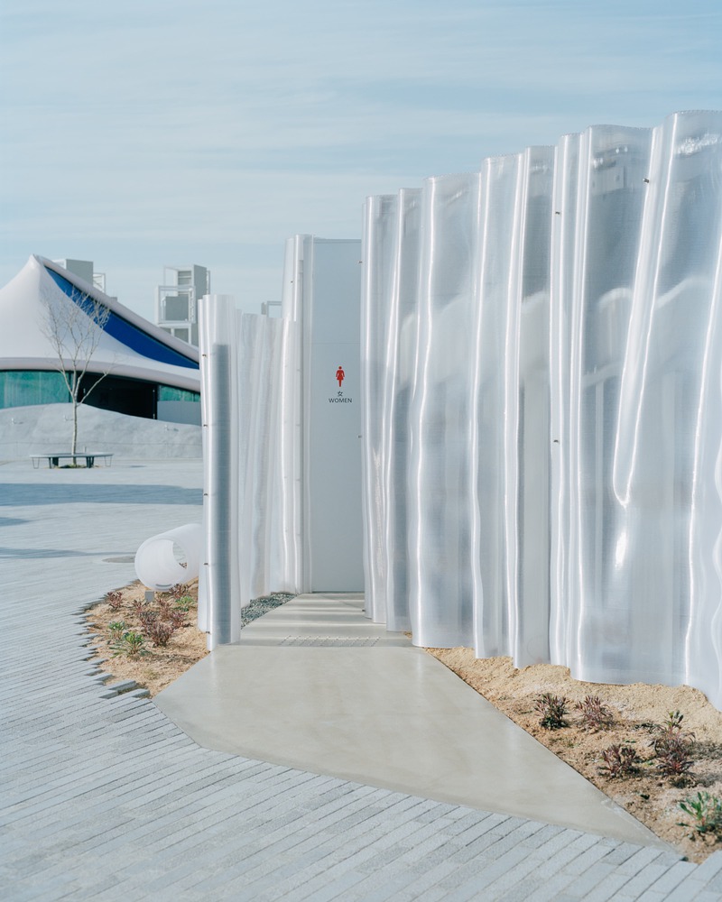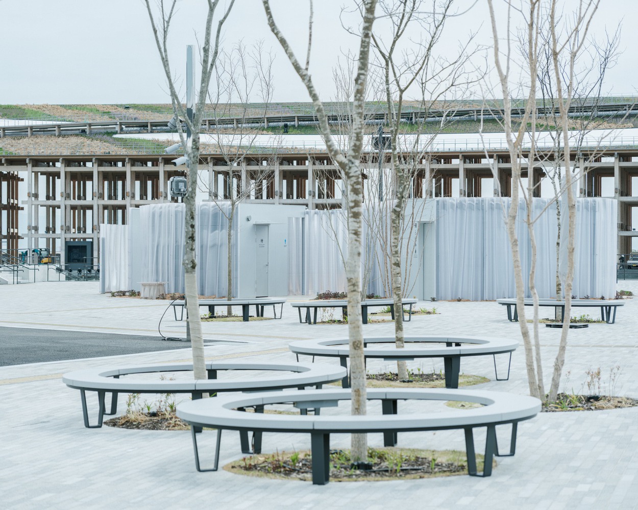 This project is a public restroom for the EXPO 2025. In response to the context of a plaza surrounded by iconic architectural landmarks, this structure was conceived not as a clearly defined form, but as something that recedes into the background—an architecture that allows only the phenomena of its surroundings to come into focus.