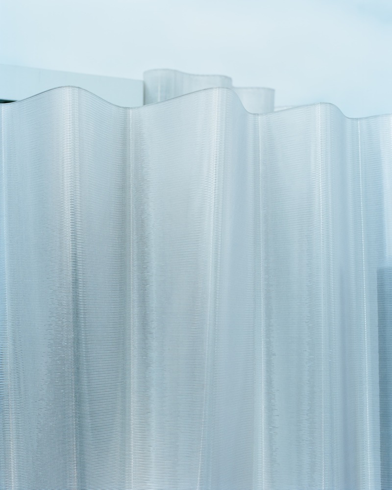 The wave-shaped 3D-printed panels inherently contain distortions from the fabrication process, which are intentionally embraced as part of the architectural expression.