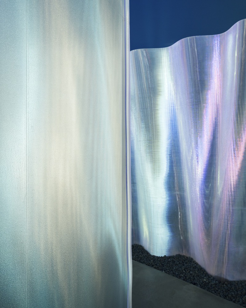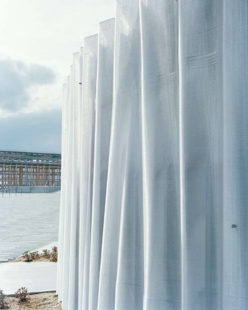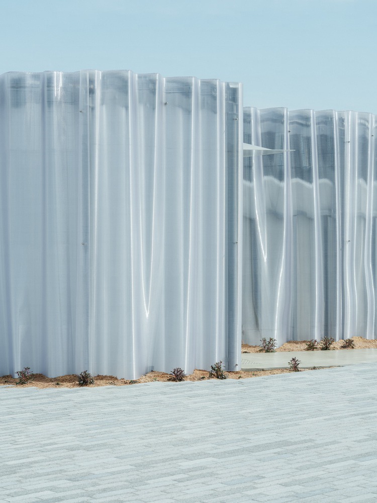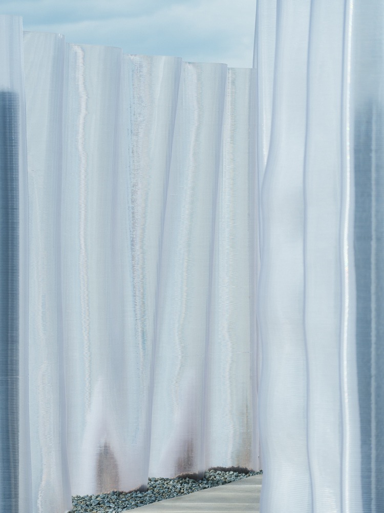 The 3D-printed panels, which combine reflectivity and translucency, intricately capture surrounding light, allowing the building's presence to emerge through its relationship with the environment.