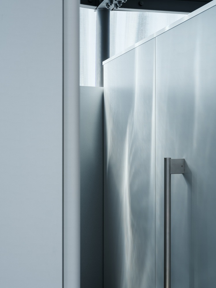 Inside, the ceiling is composed of soft aluminum insulation, creating a gently glowing surface of light. In the accessible restroom, dual layers of 3D-printed walls generate a full-height luminous plane.