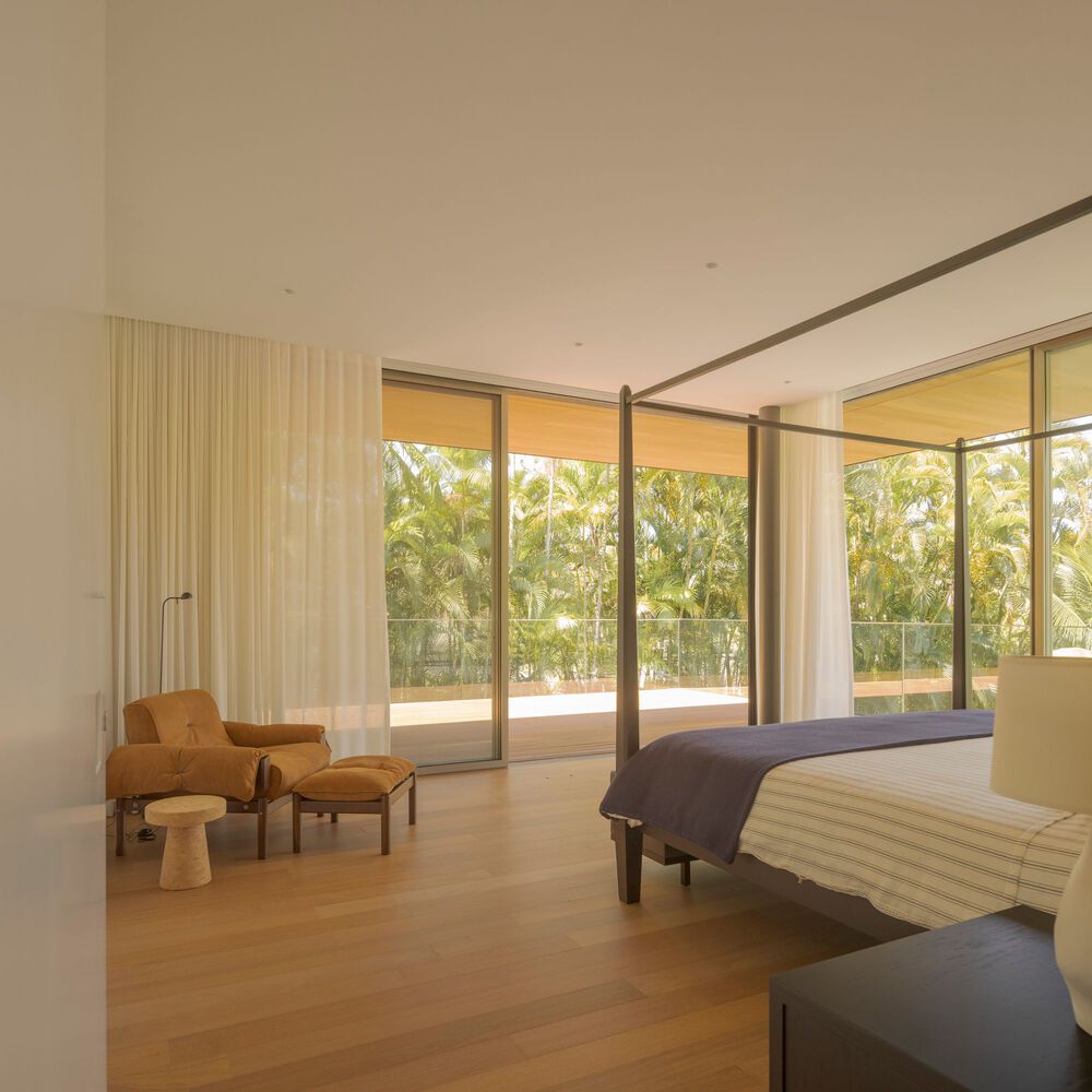 The family suites are connected by a generous balcony from which one can observe the activities on the lawn and the ocean horizon. The volume of the guest rooms becomes the cantilever of the portecochère, supported by a metal lattice structure.