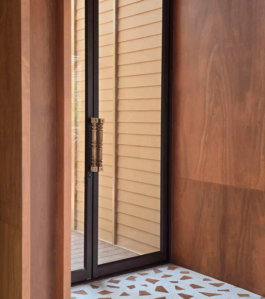 These were broken, reorganized, and patterned by local craftsmen, introducing a playful and tactile detail to the interior.