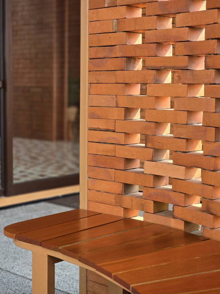 Solid red bricks were playfully arranged along a curving entryway, inspired by traditional pottery forms.