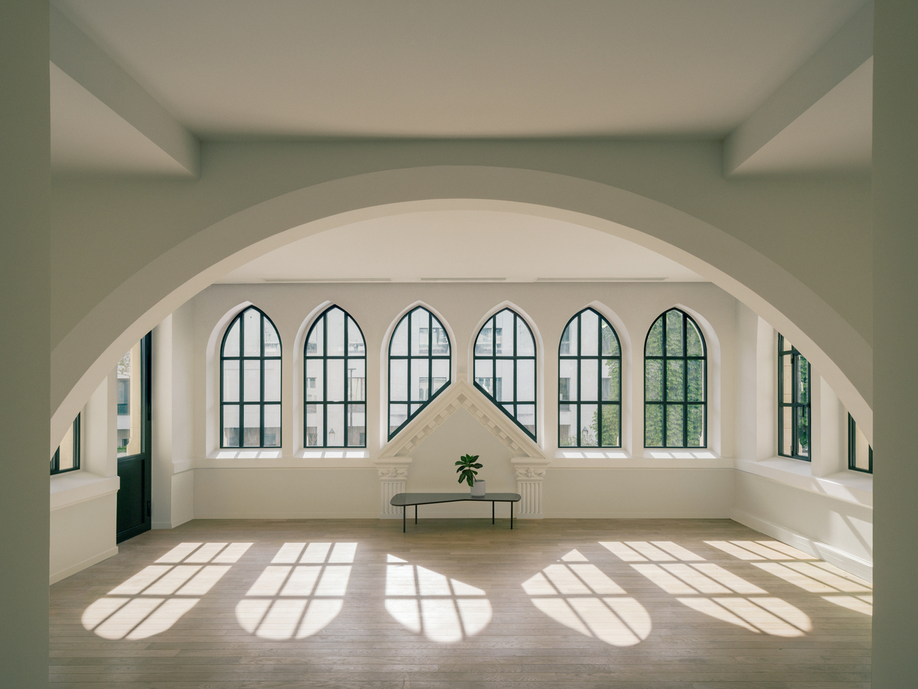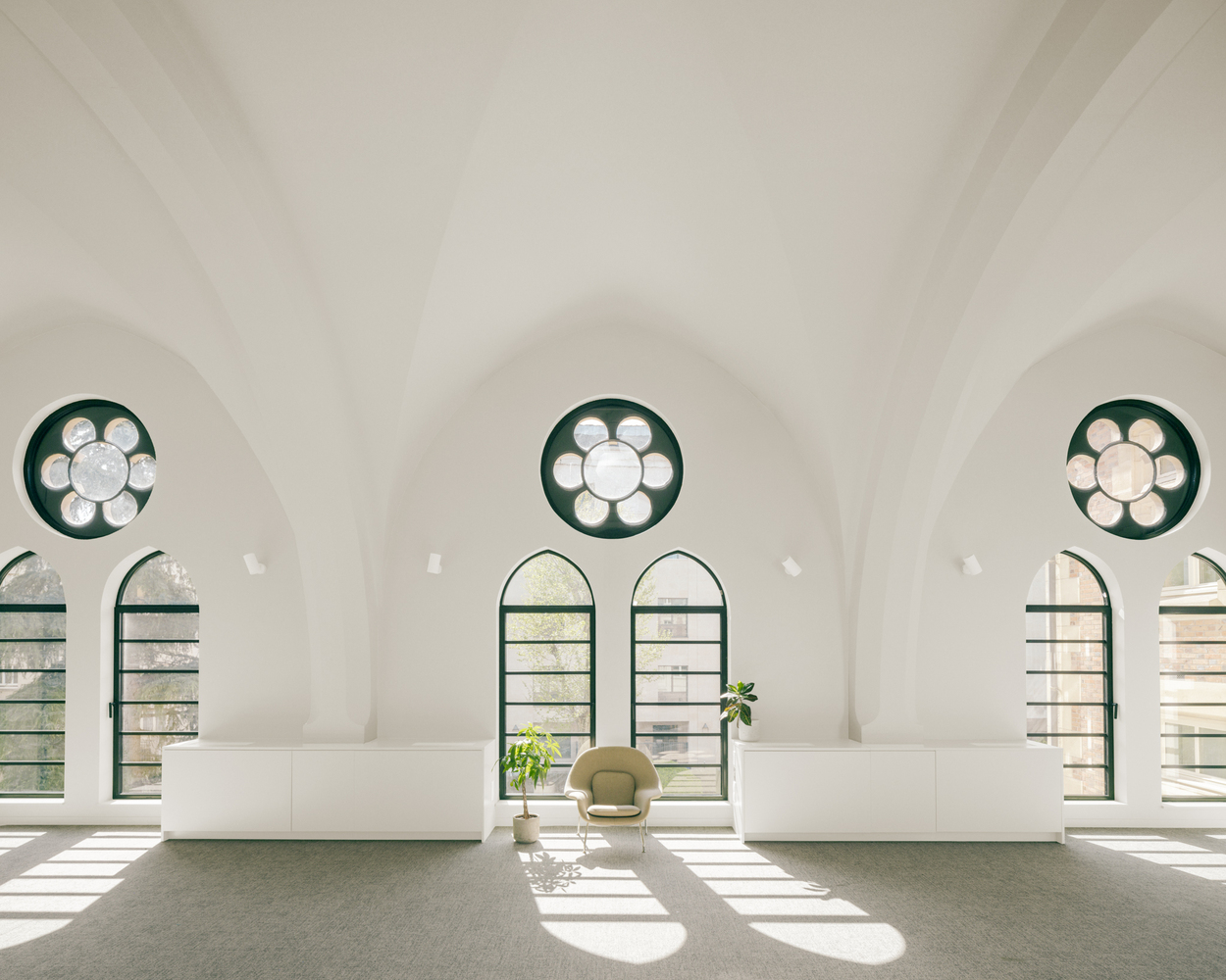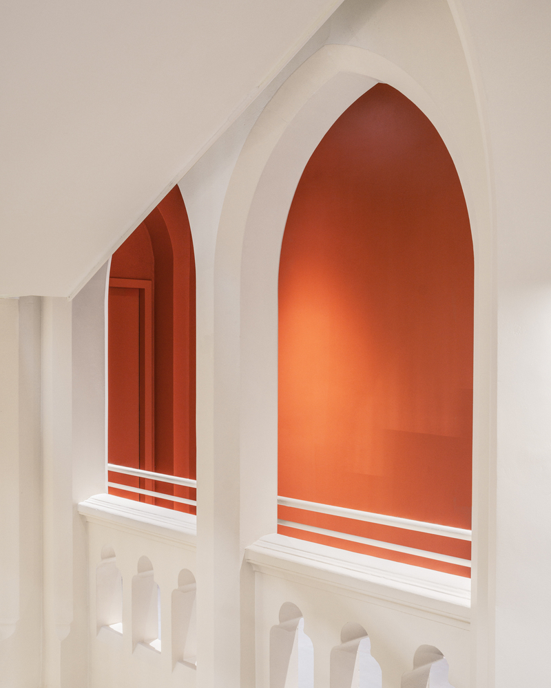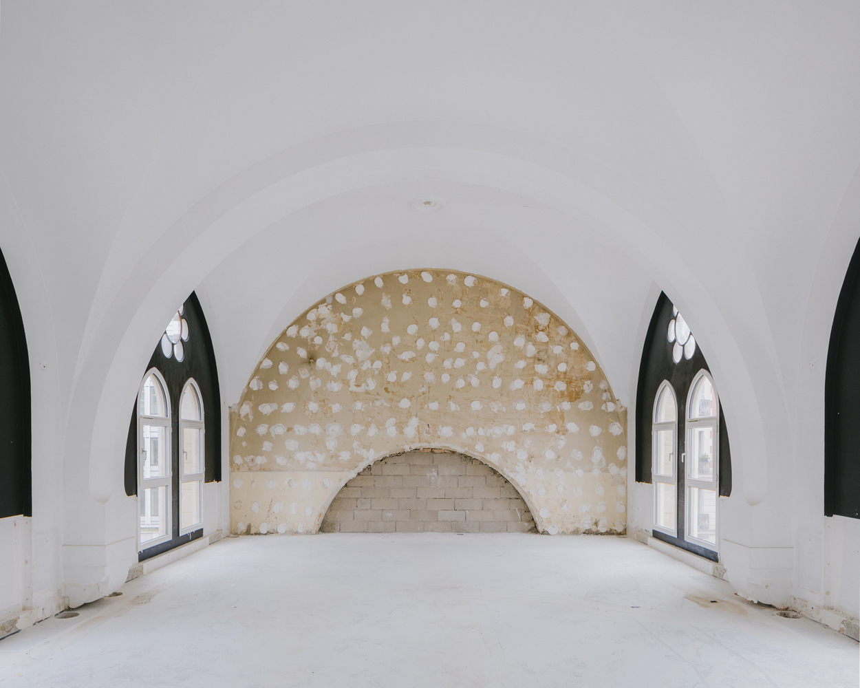 The interior architecture, vaults, ribs, and moldings are revealed through precise and careful work.