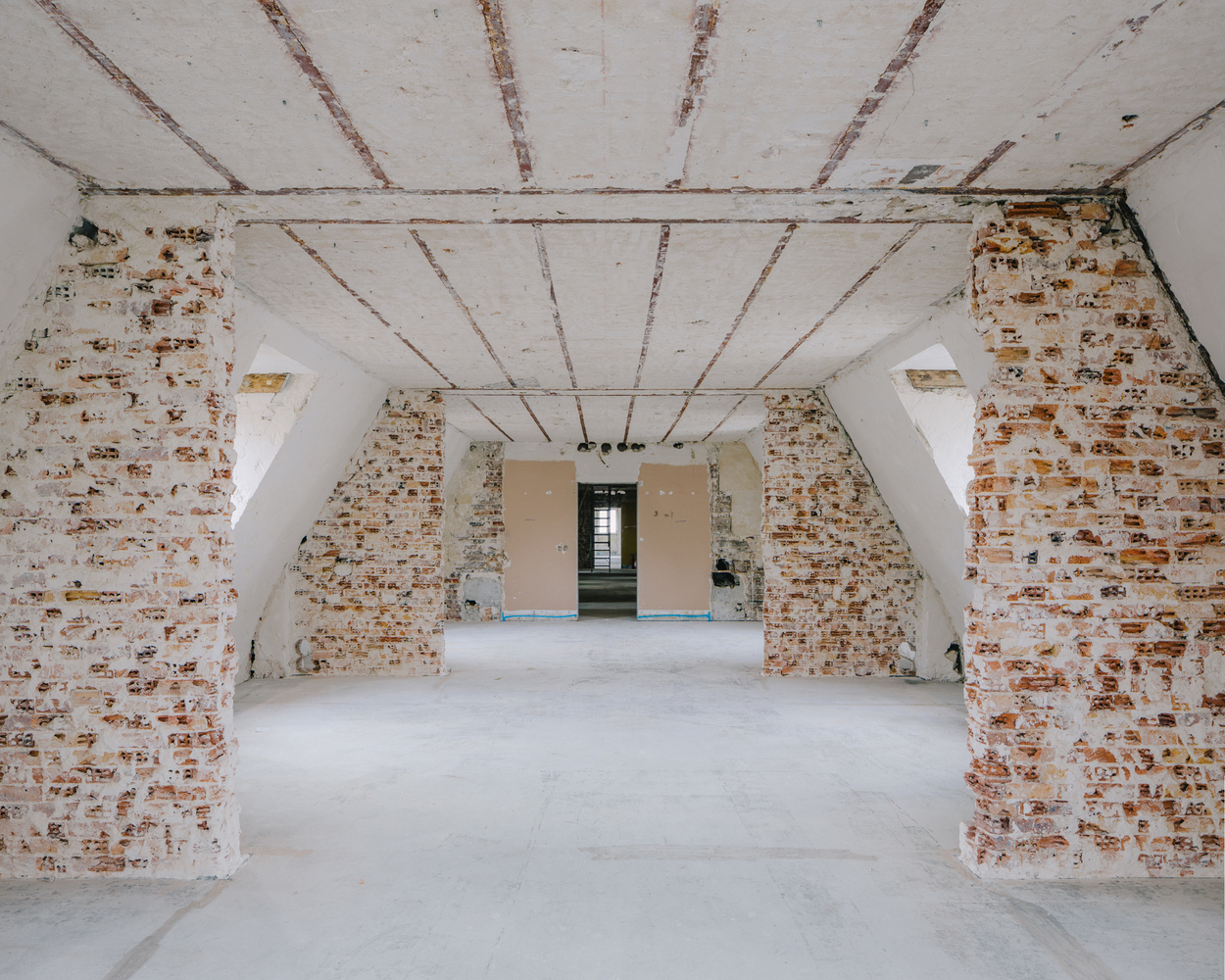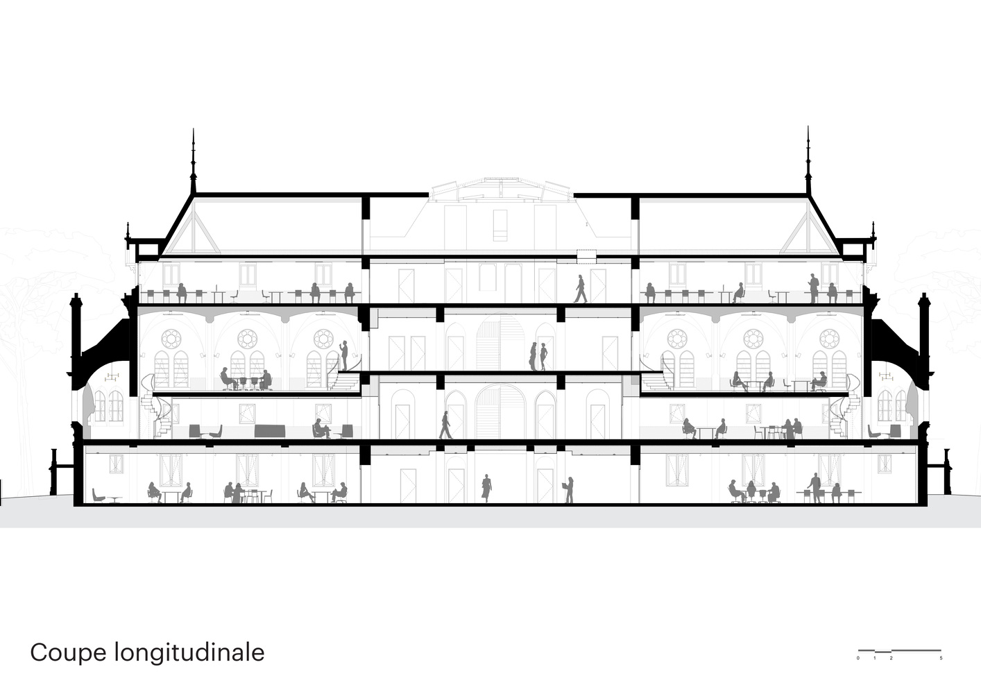 Spaces are enhanced, particularly through the recovery of previously unused attic areas, creating a unique and stimulating work environment for future users.