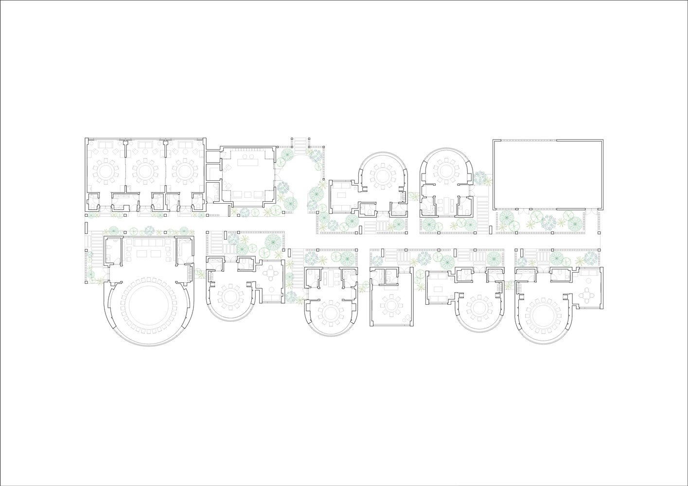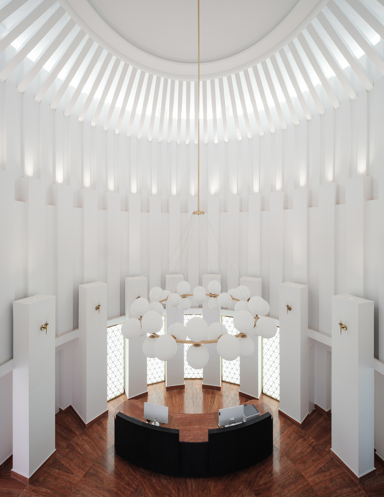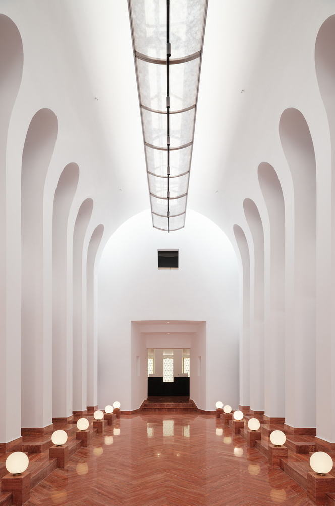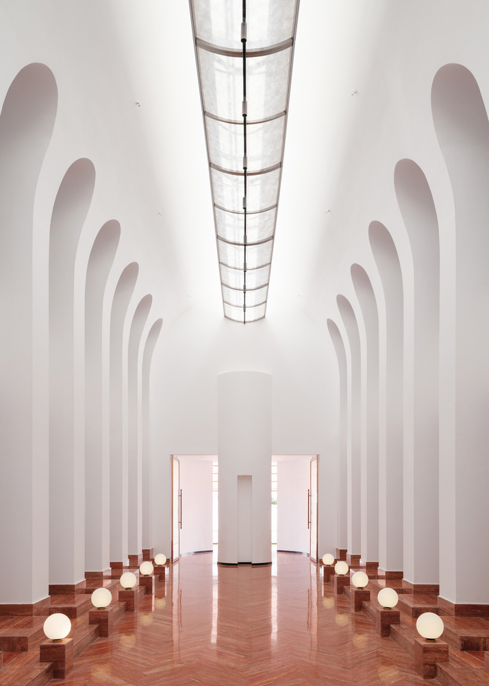 These dining pods are interconnected through a series of white-clad garden cloisters enveloped by lush vegetation, creating a carefully choreographed transition between privacy and communal leisure.