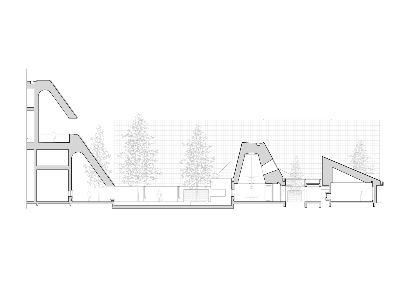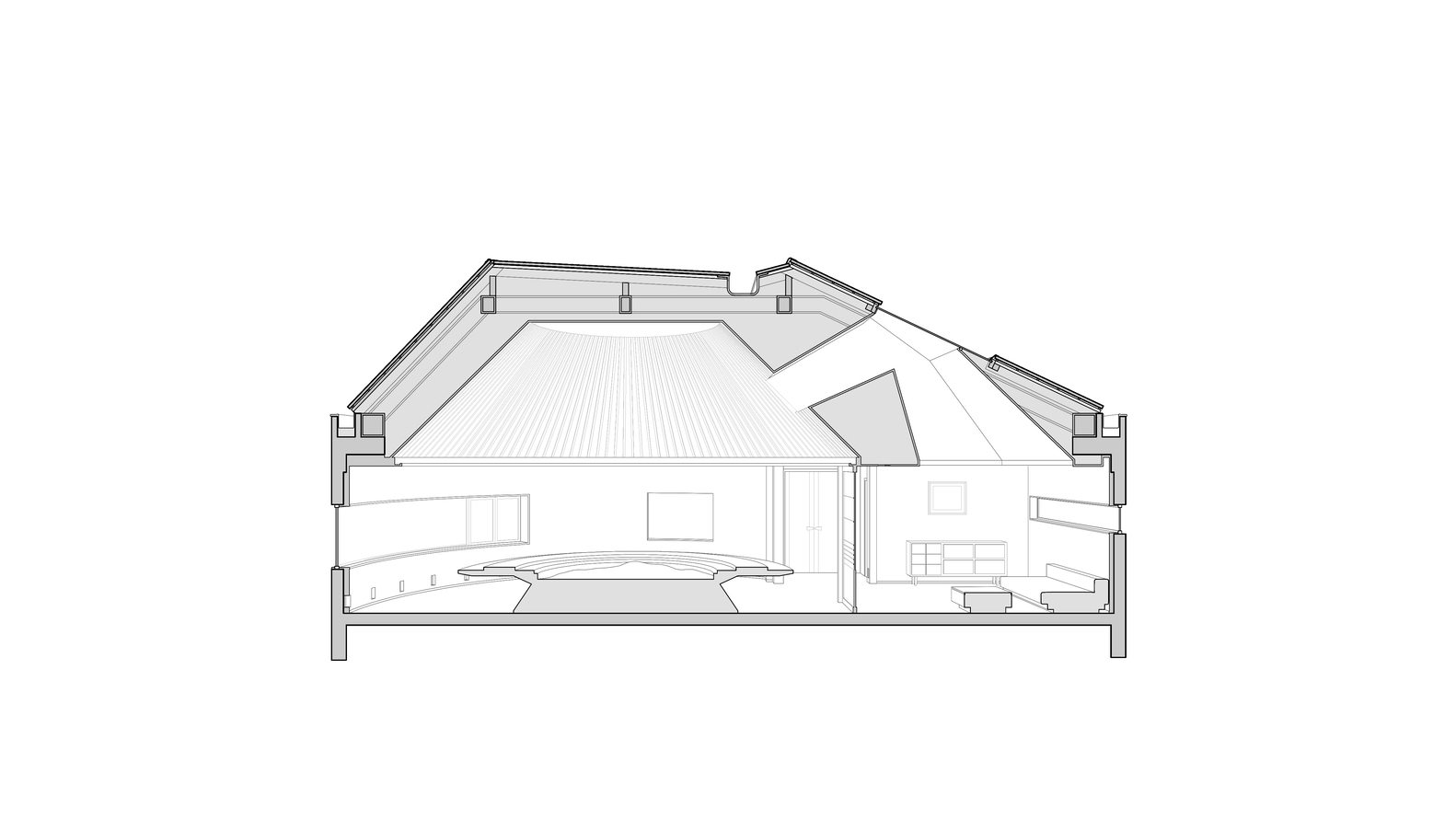 The hotel's core banquet facilities demonstrate exceptional spatial efficiency through their clustered organization beneath expansive mono-pitch roofs.