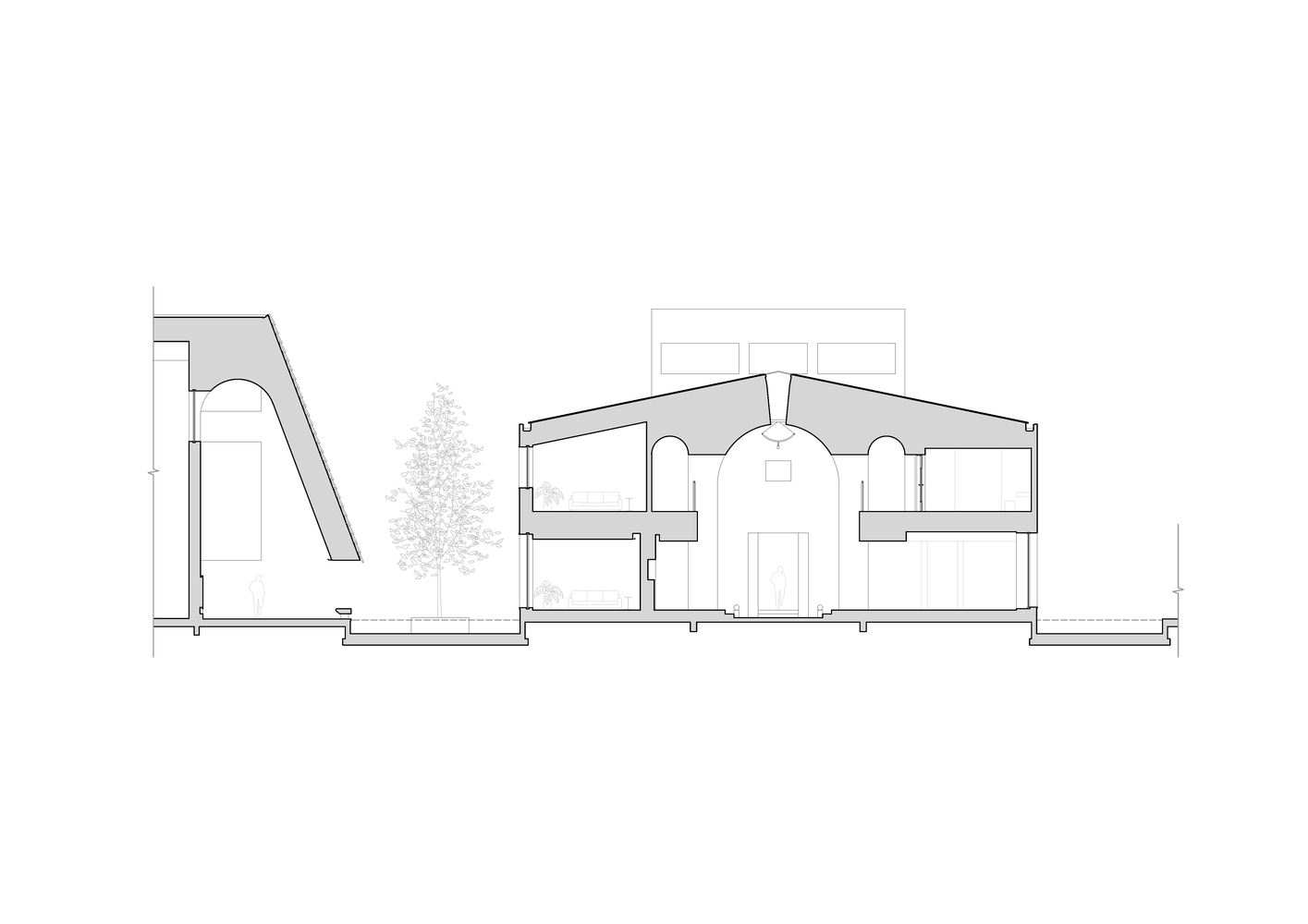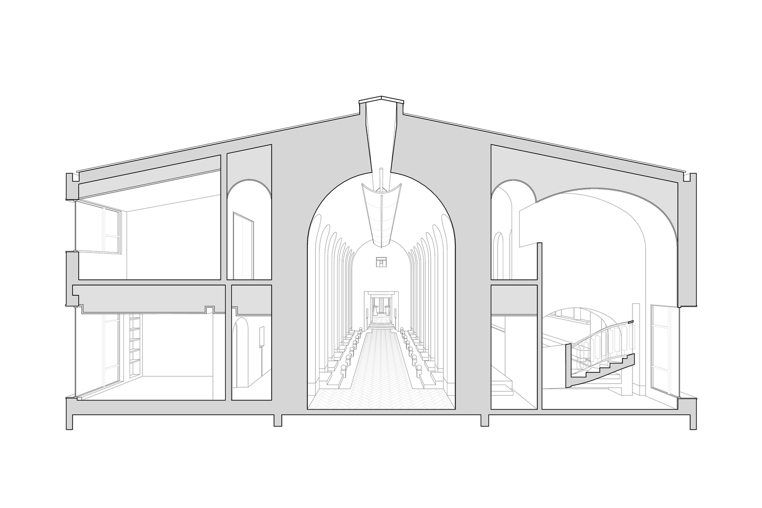 The architectural composition centers around a dramatic 12-meter-high gabled entrance that cantilevers 4 meters outward, evoking ecclesiastical grandeur while serving as the main entrance.