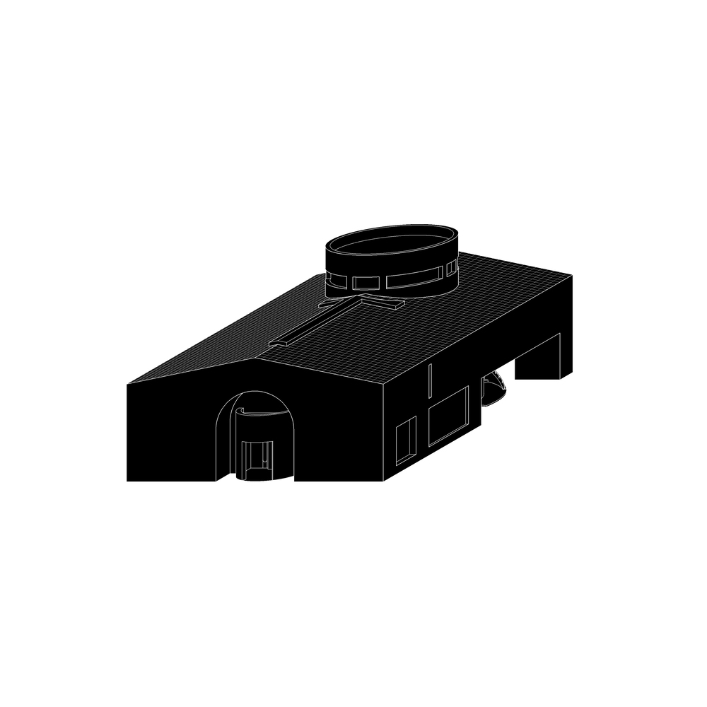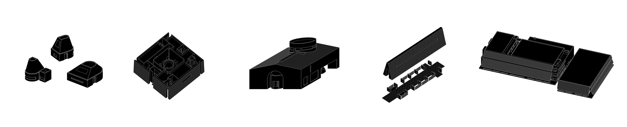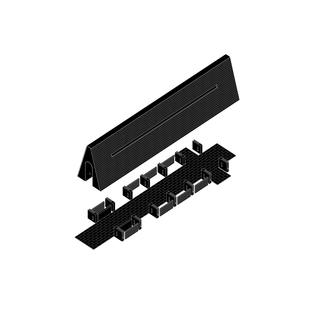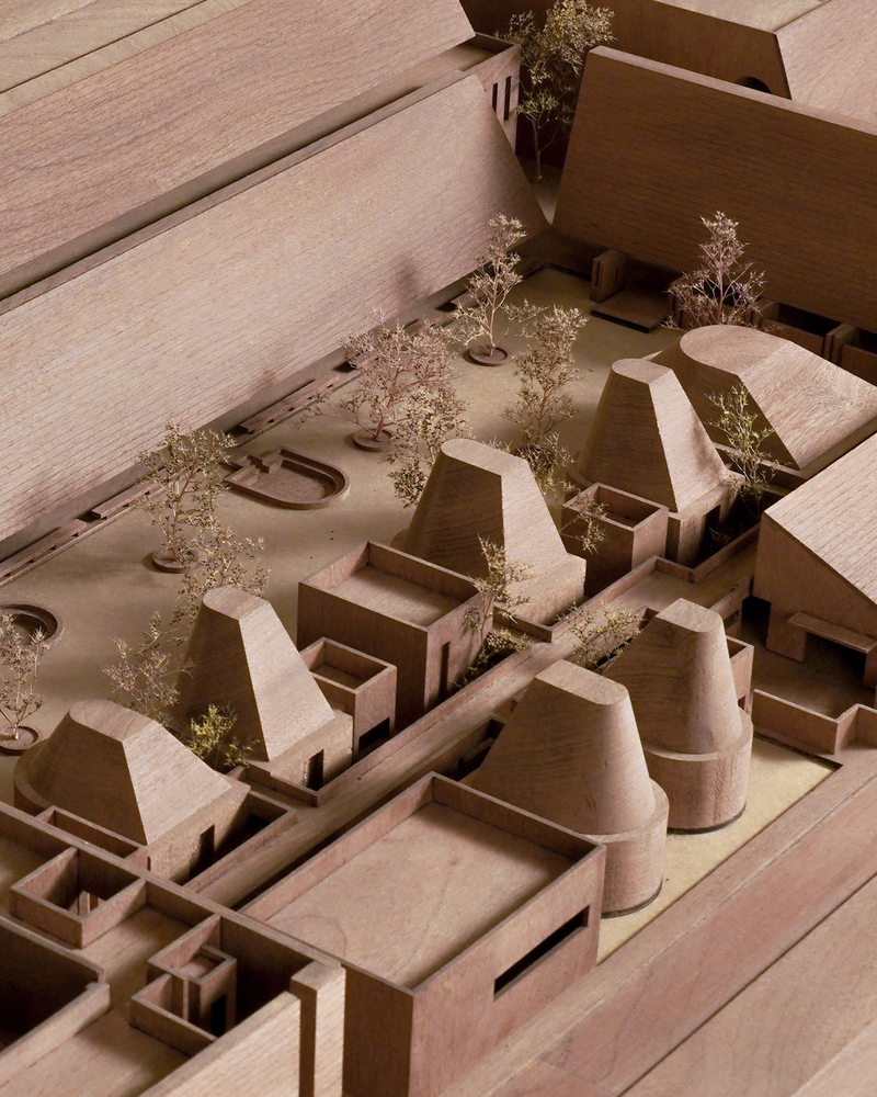 The architects have conceived the complex through an abstract settlement approach, where three distinct architectural scales - monumental pitched roofs, mid-scale geometric volumes, and clusters of compact functional units - are unified through an implicit structural logic.