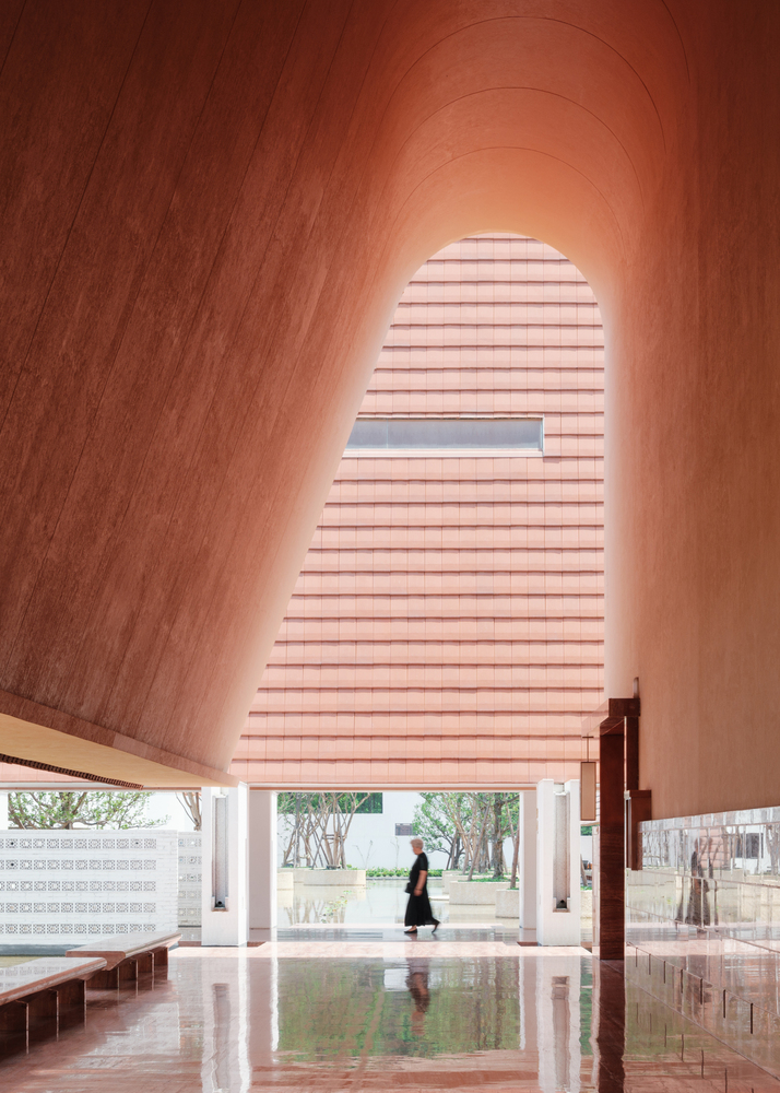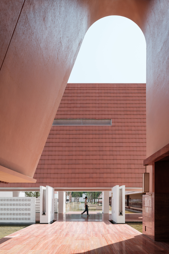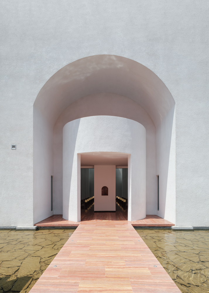 Adjacent to this monumental gateway, the reception center manifests as a white barn-like structure floating serenely on water, accessible exclusively via the main corridor.