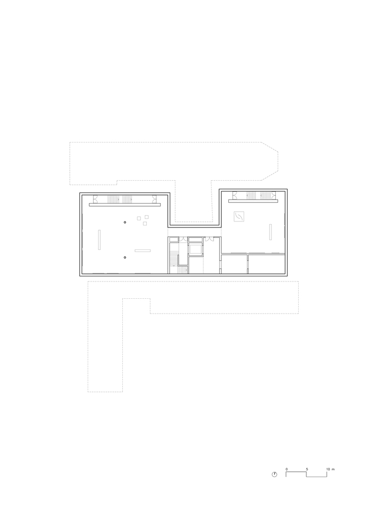 While the exhibition area is located below the complex, the distinctive presence of the new park pavilion establishes a dialogue with the historic structures, both through its form, which evokes the verticality of their sloping roofs, and through the logic of its orthogonal arrangement.
