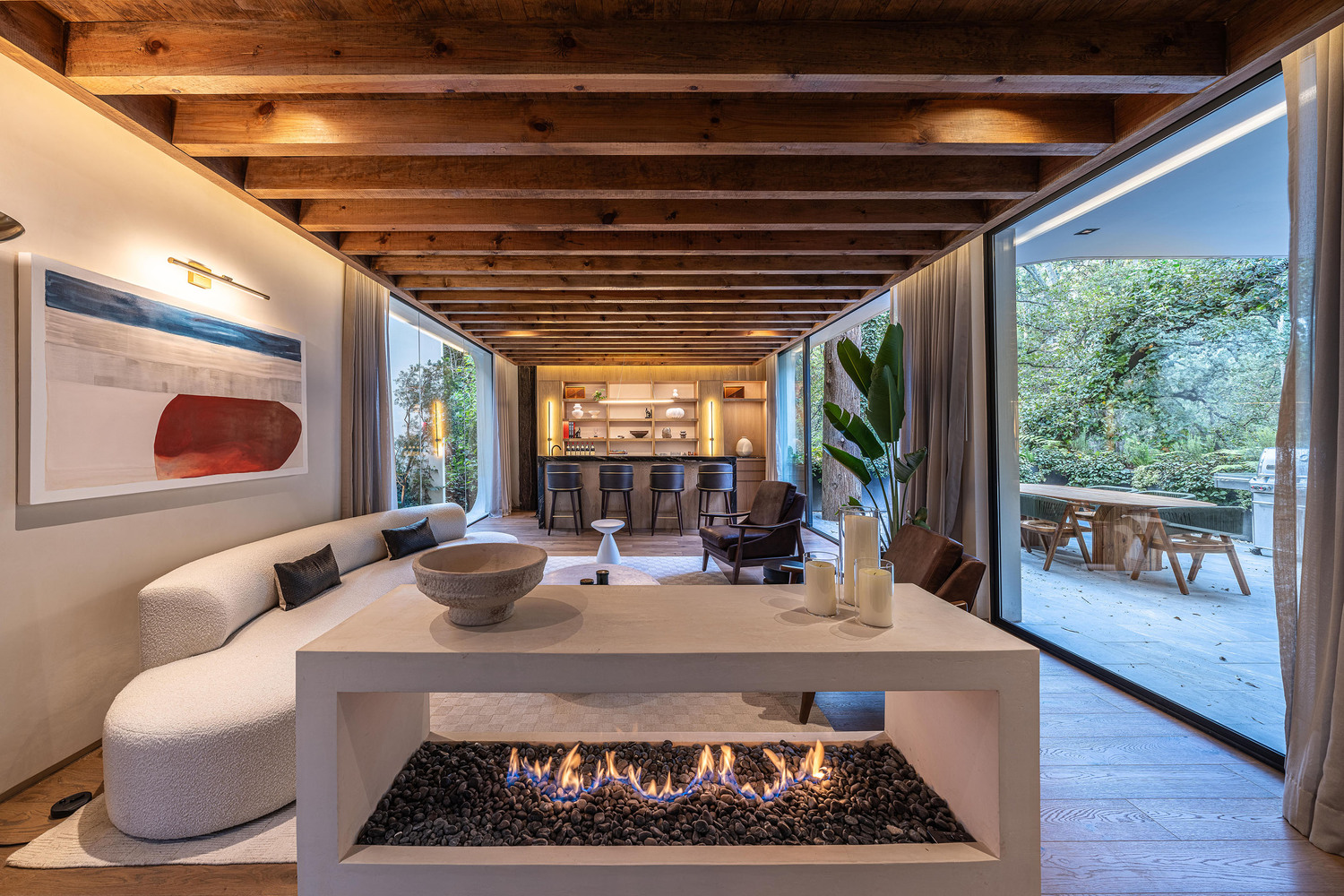 chukum plaster, natural wood, and black aluminum framing come together to define a contemporary and serene atmosphere.