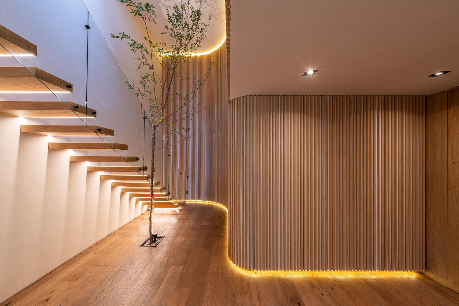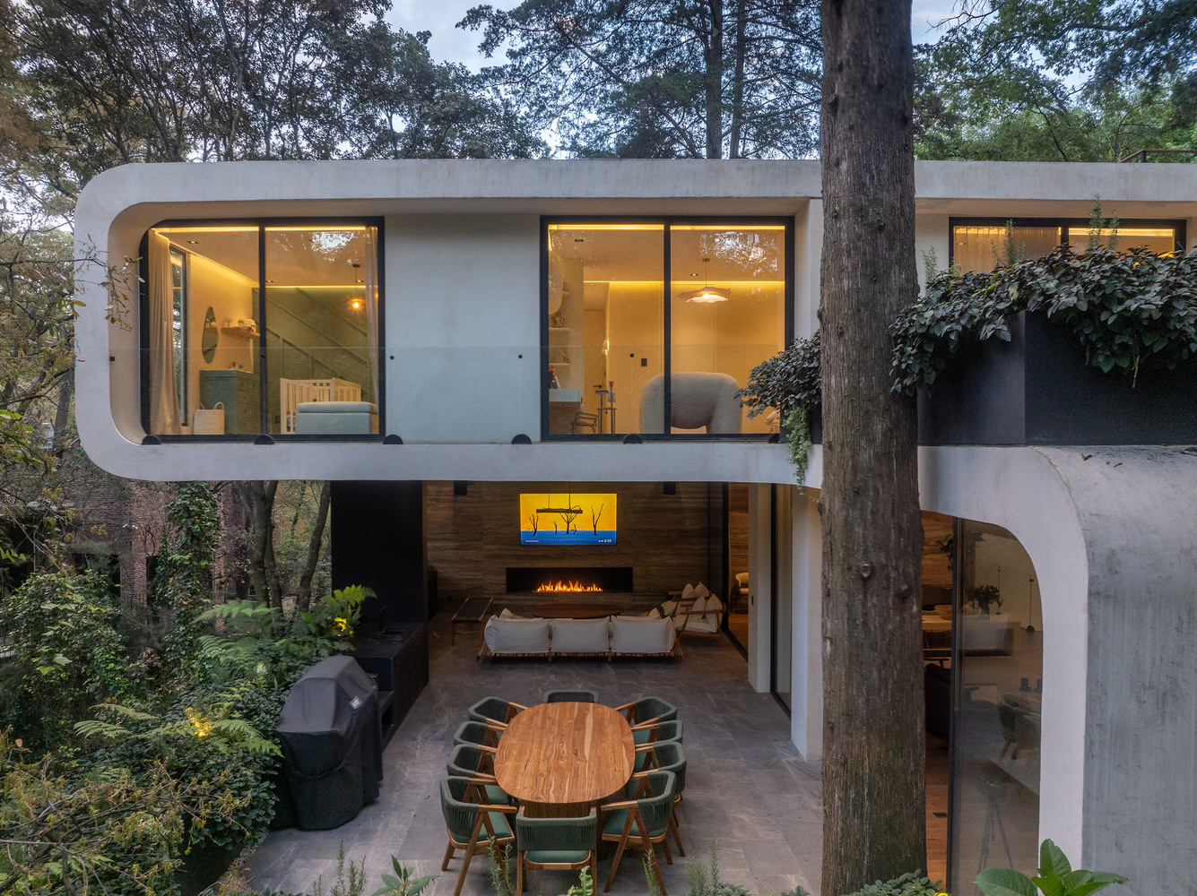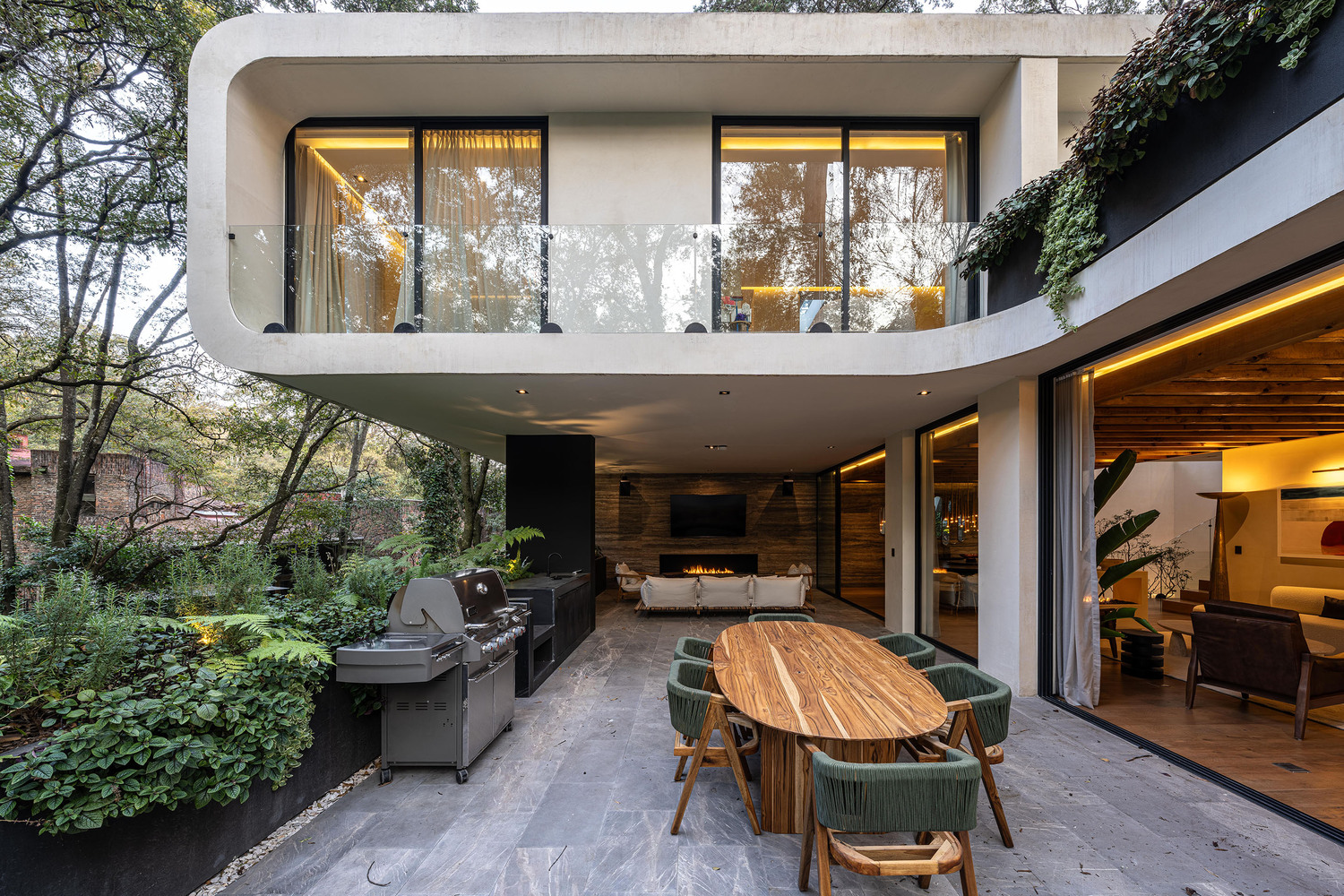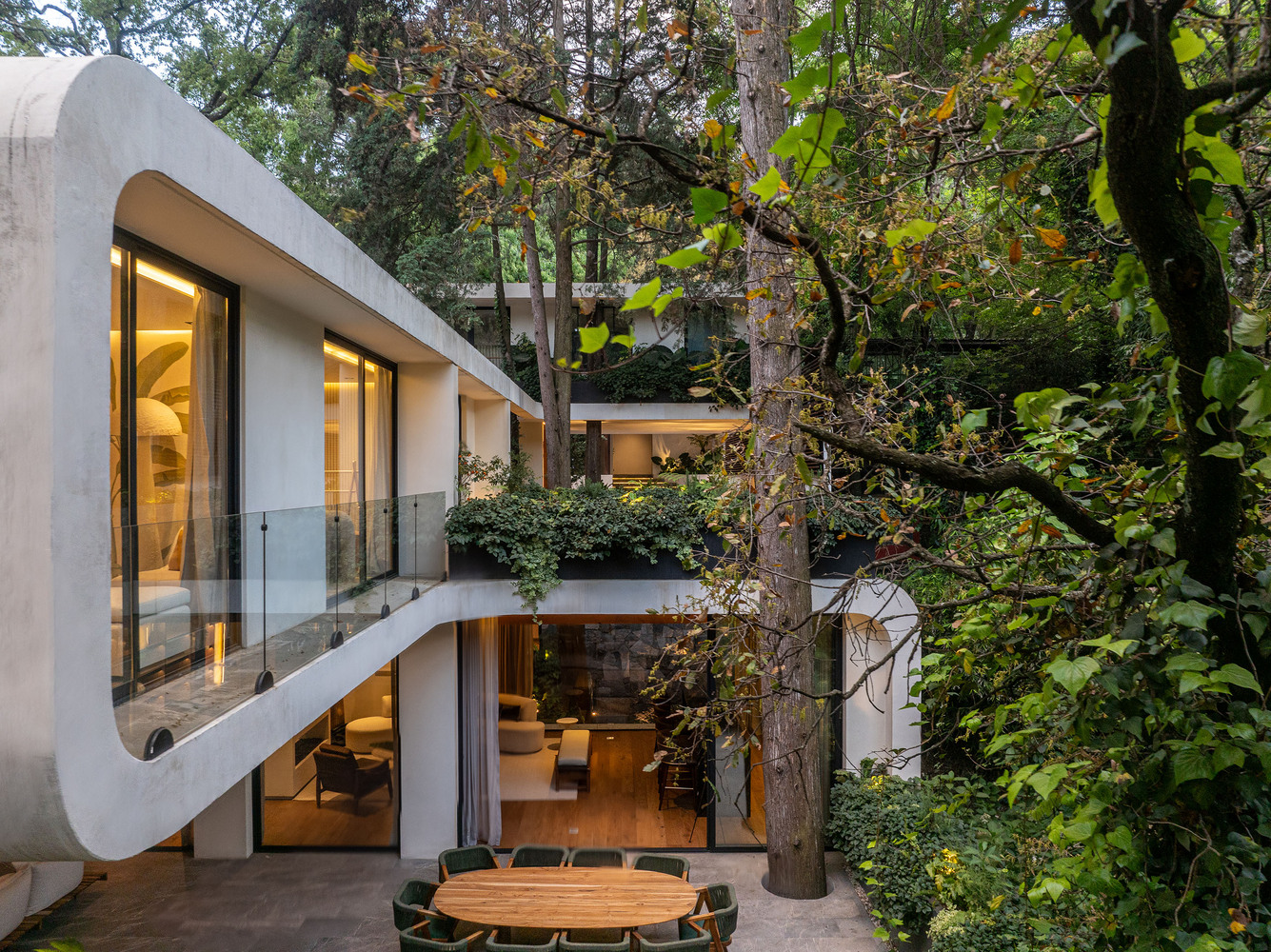 These landscaped spaces, in conjunction with terraces and balconies, contribute to the home’s biophilic character and visual richness.