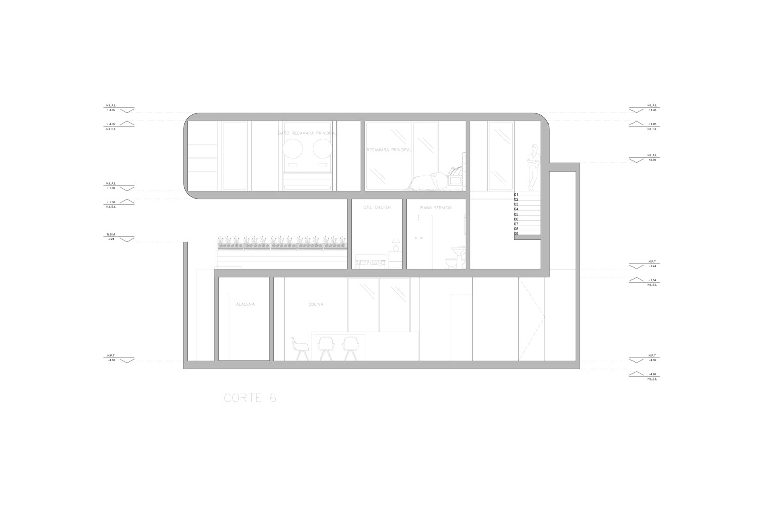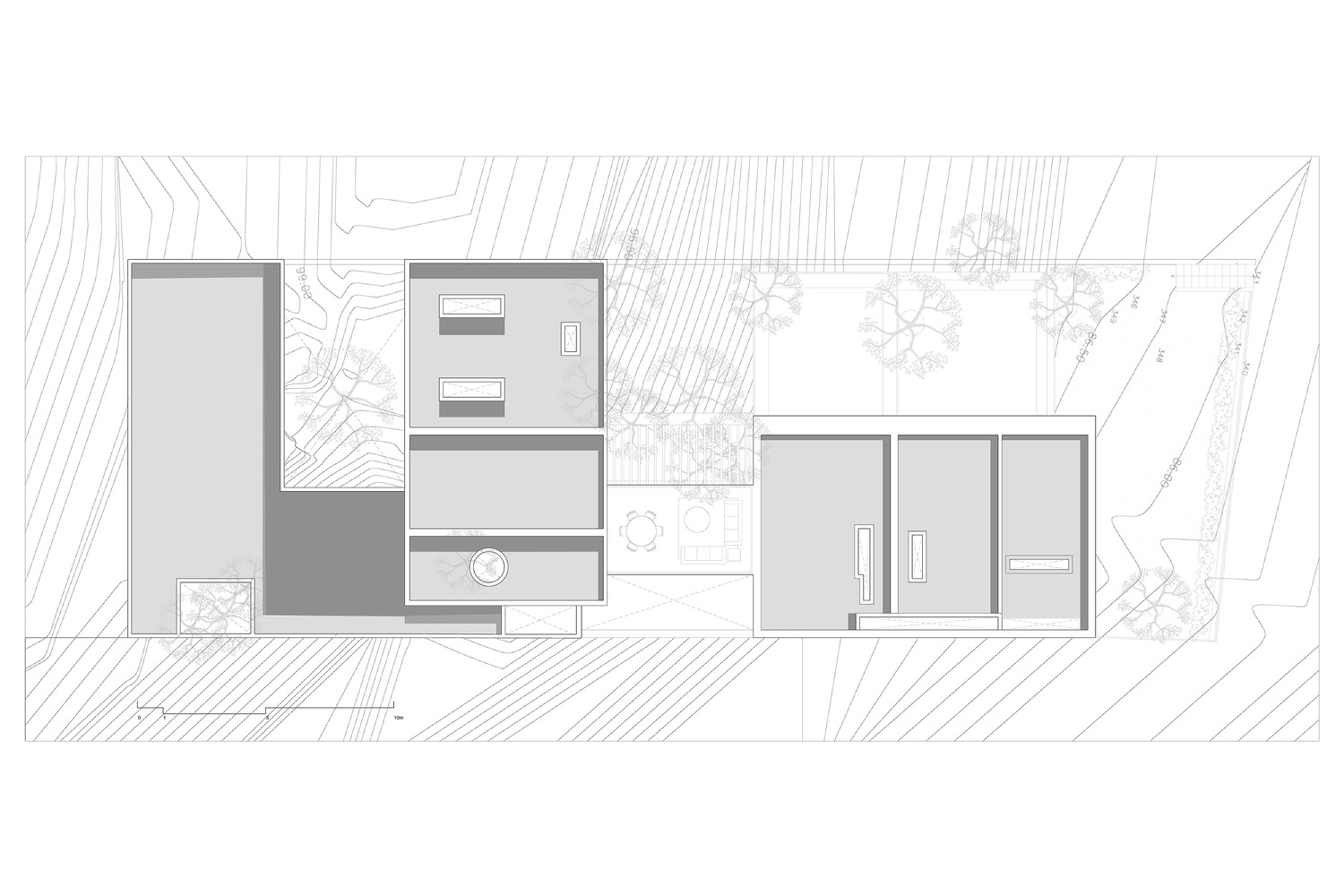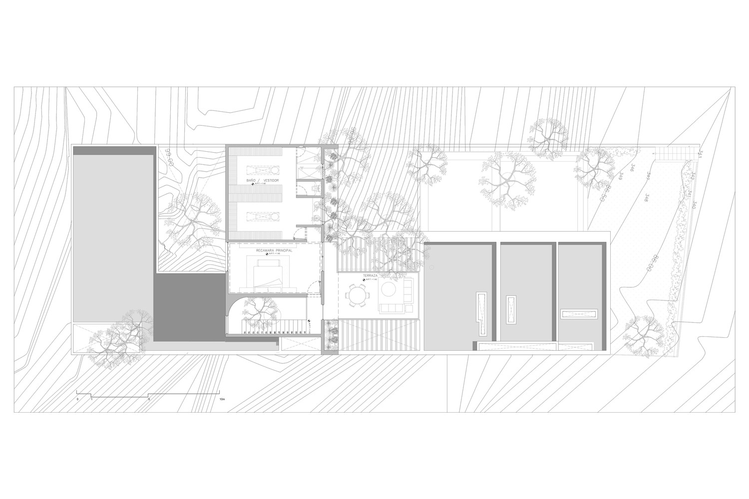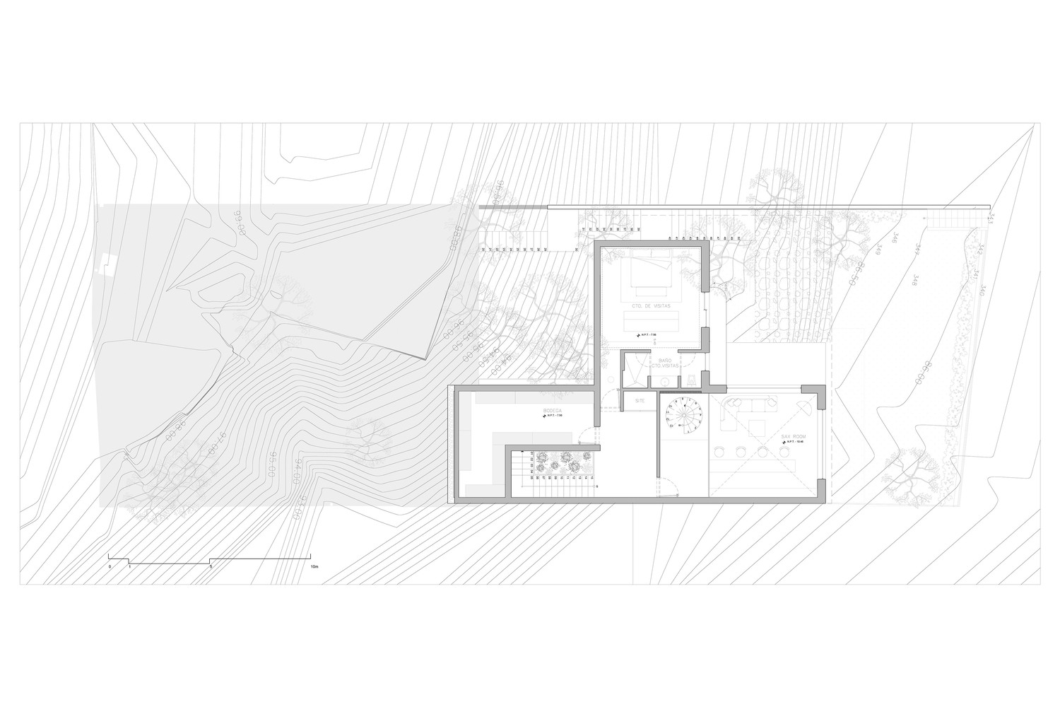 This level, located 7.91 meters below the street, provides a sense of retreat and privacy reinforced by the site’s natural grade.
