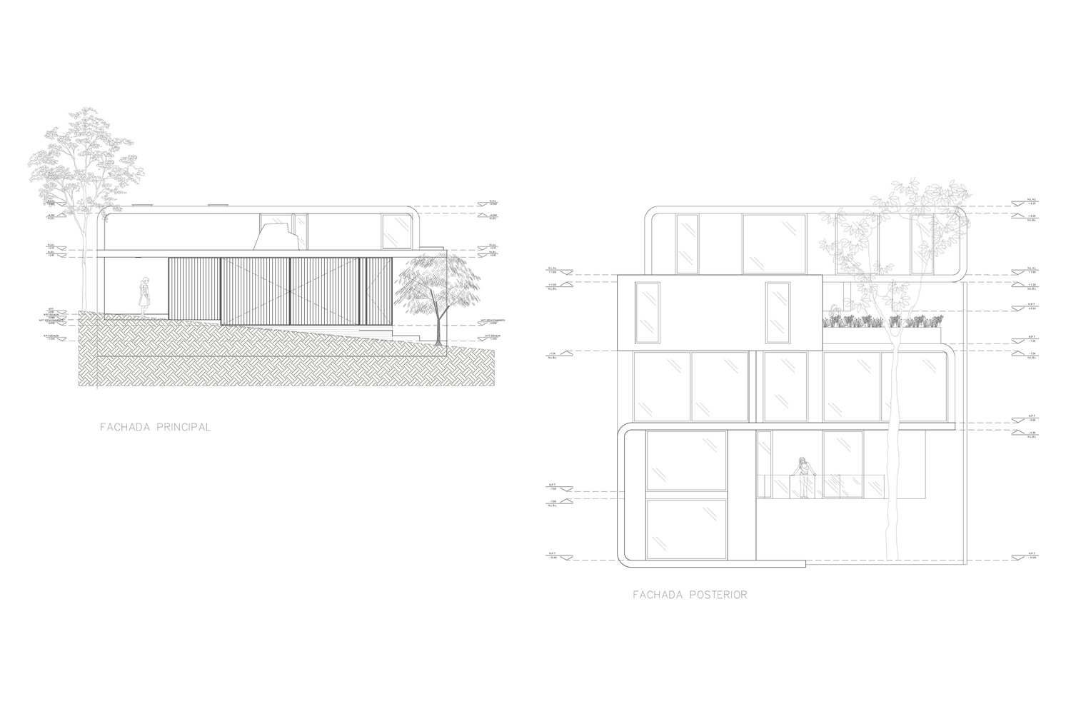 Built on a 678.85 m² plot, the architectural strategy embraces the site's downward gradient through a stepped volumetry that anchors the structure into the terrain, offering a fluid spatial descent across five levels—two above and three below street level.