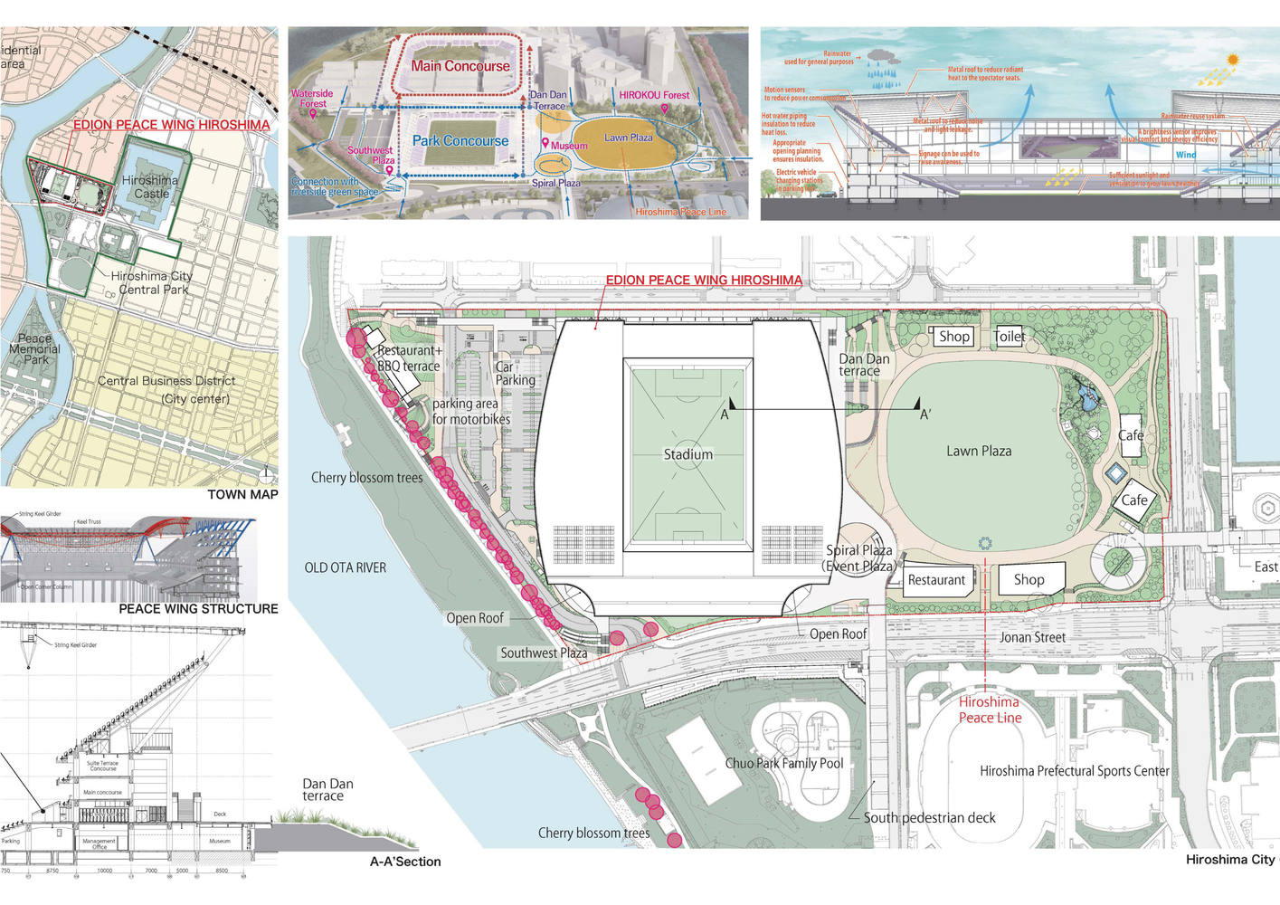 Urban stadium park with "Wings of Peace" as a symbol of Hiroshima, an International Peace Culture City, to deliver moving and exciting experiences