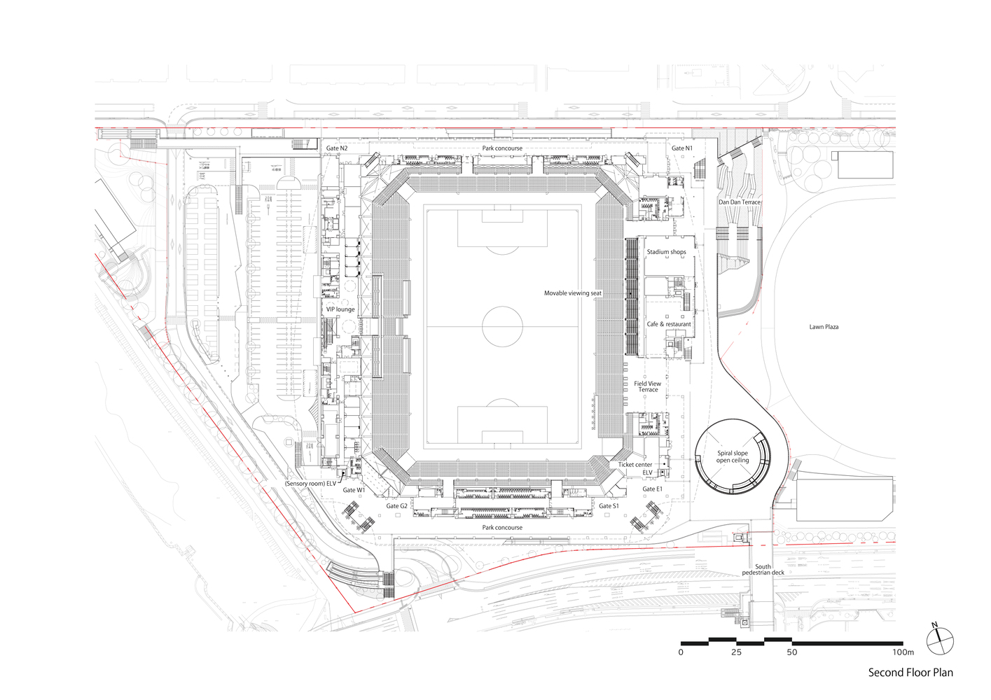 The third floor of the stadium has a 10-meter-wide main concourse designed to serve as a main circulation path that spectators can use to walk around the stadium on game days.