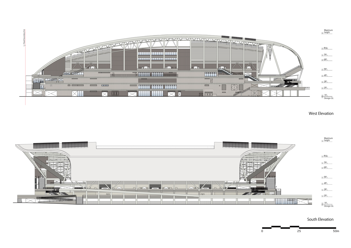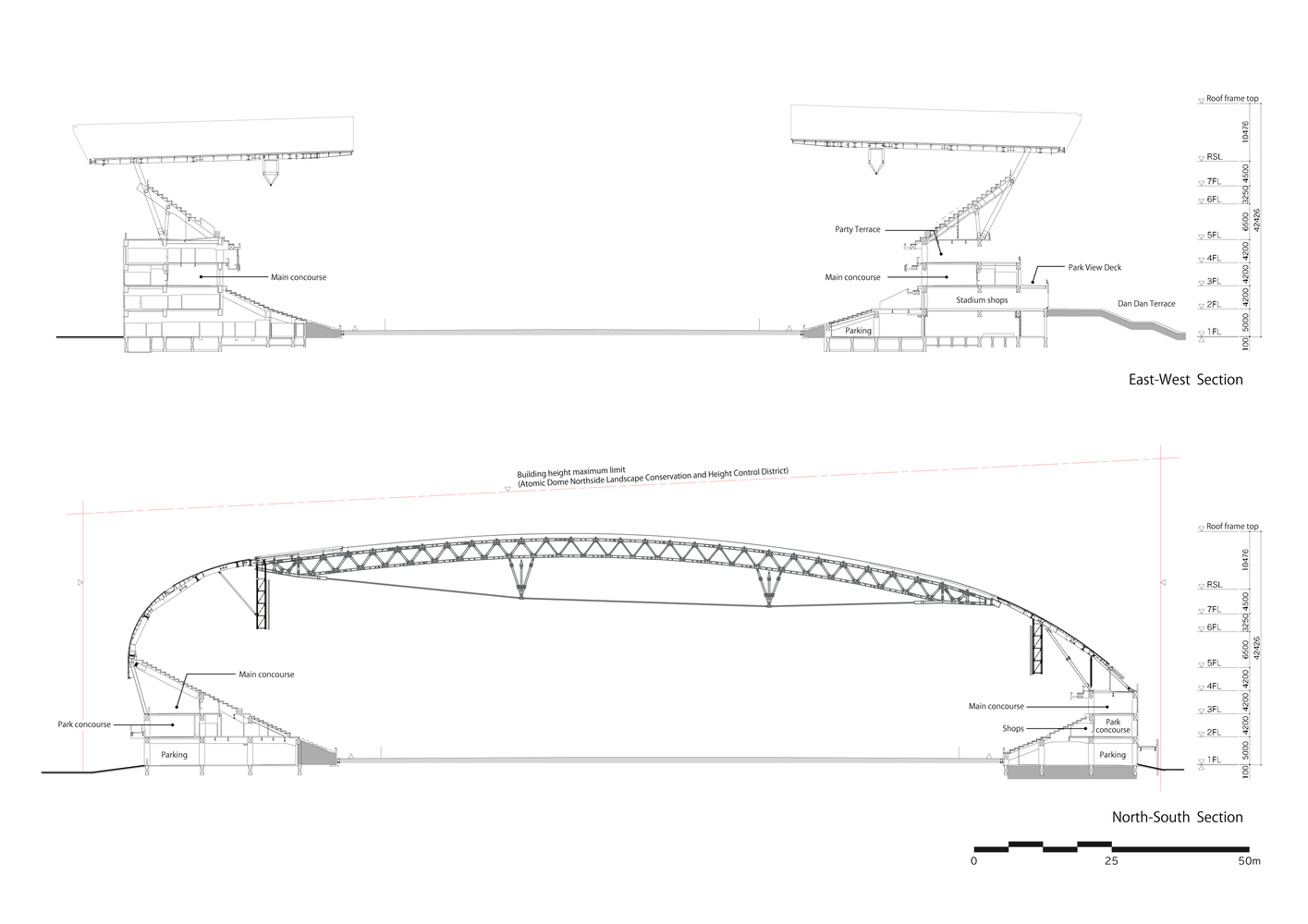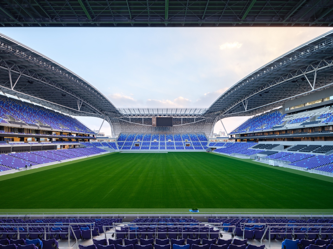 Oriented north-south to meet the international stadium criteria, the "Urban stadium" is located to the west of Central Park and adjoins a Lawn Plaza on the east side.